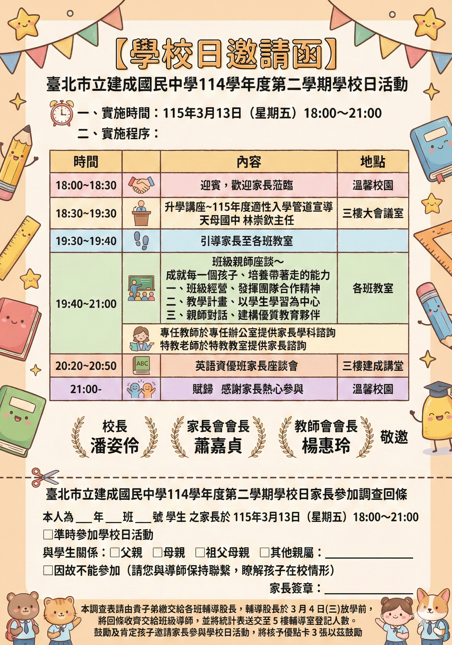 為促進親師溝通,並讓您更了解孩子在校的學習與生活,本校將舉辦114學年度第2學期學校日活動,誠摯邀請您撥冗參加。