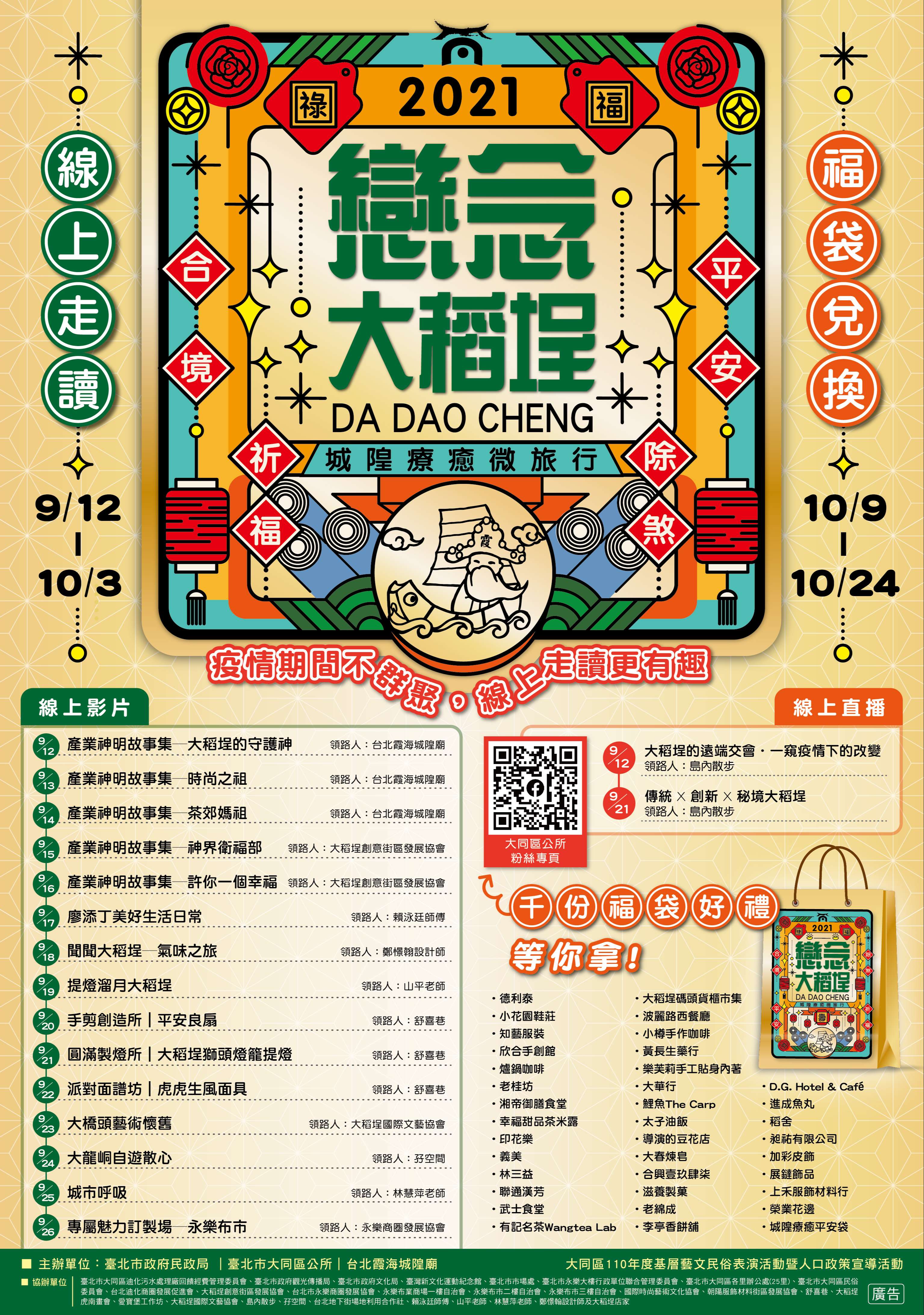 「2021戀念大稻埕─城隍療癒微旅行」線上活動,將於9月12日(日)至10月24日(日),在"臺北市大同區公所"臉書粉絲專頁溫暖登場,推出17條線上走讀路線,以及千份超值店家福袋好禮等您來抽獎。歡迎市民朋友相揪上線來參加,活動詳情請關注「當我們同在一起(臺北市大同區公所)」臉書粉專(https://www. facebook.com/DatongDO/)或電洽(02)25975323分機802陳先生。