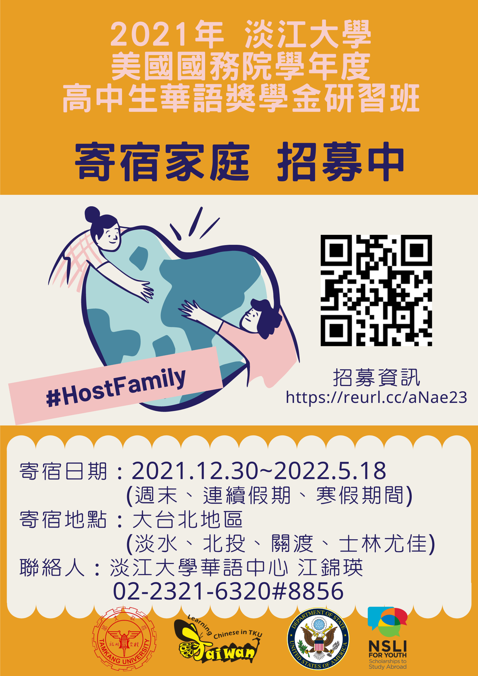 一、淡江大學學校財團法人淡江大學推廣教育處華語中心承辦「美國國務院NSLI-Y高中生華語獎學金研習班」徵選臺灣寄宿家庭,歡迎踴躍報名。