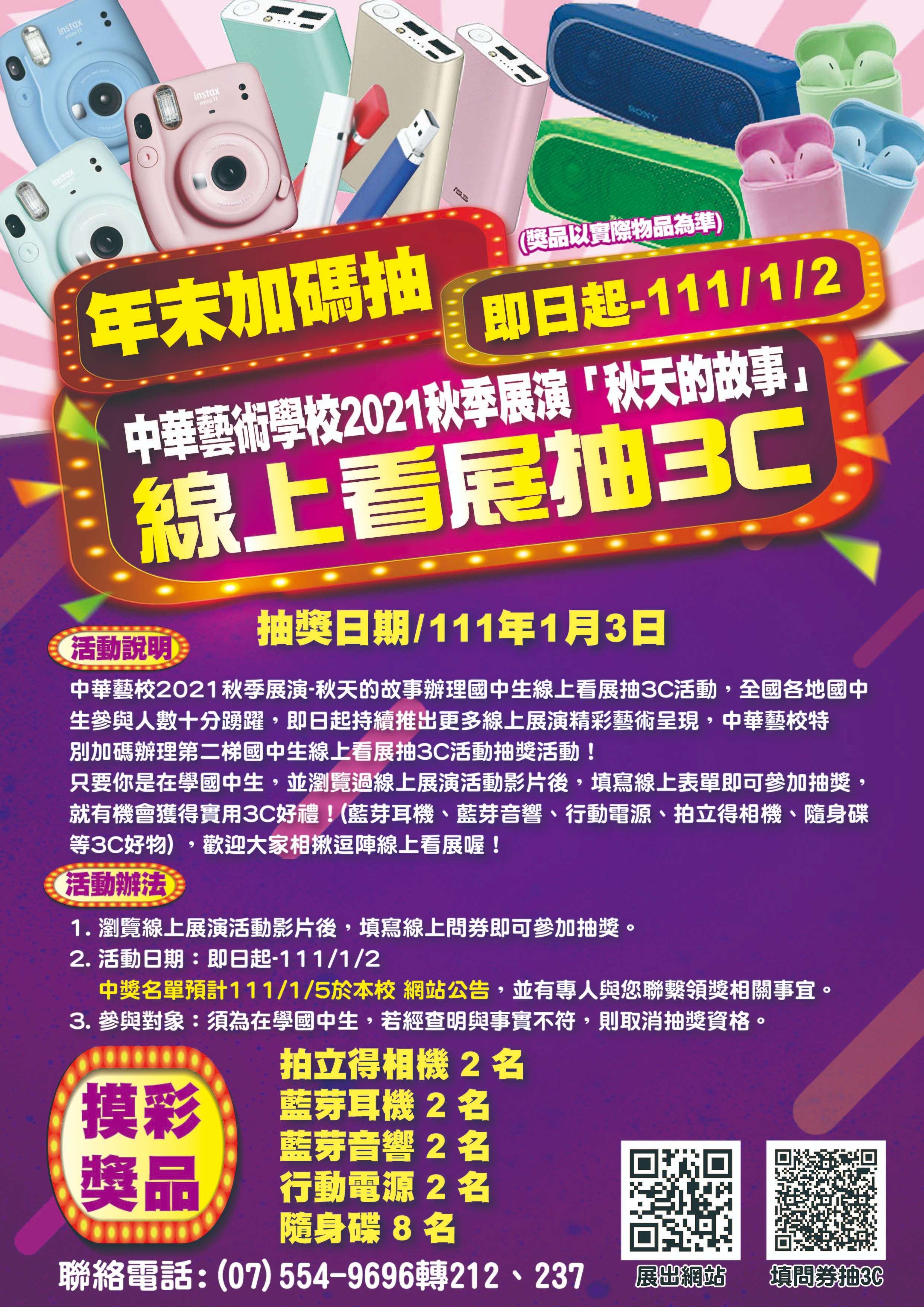 一、中華藝校2021秋季展演-秋天的故事辦理國中生線上看展抽3C活動,全國各地國中生參與人數踴躍,即日起持續推出更多線上展演精彩藝術呈現,瀏覽線上展演活動影片後填寫線上問卷即可參加抽獎活動。