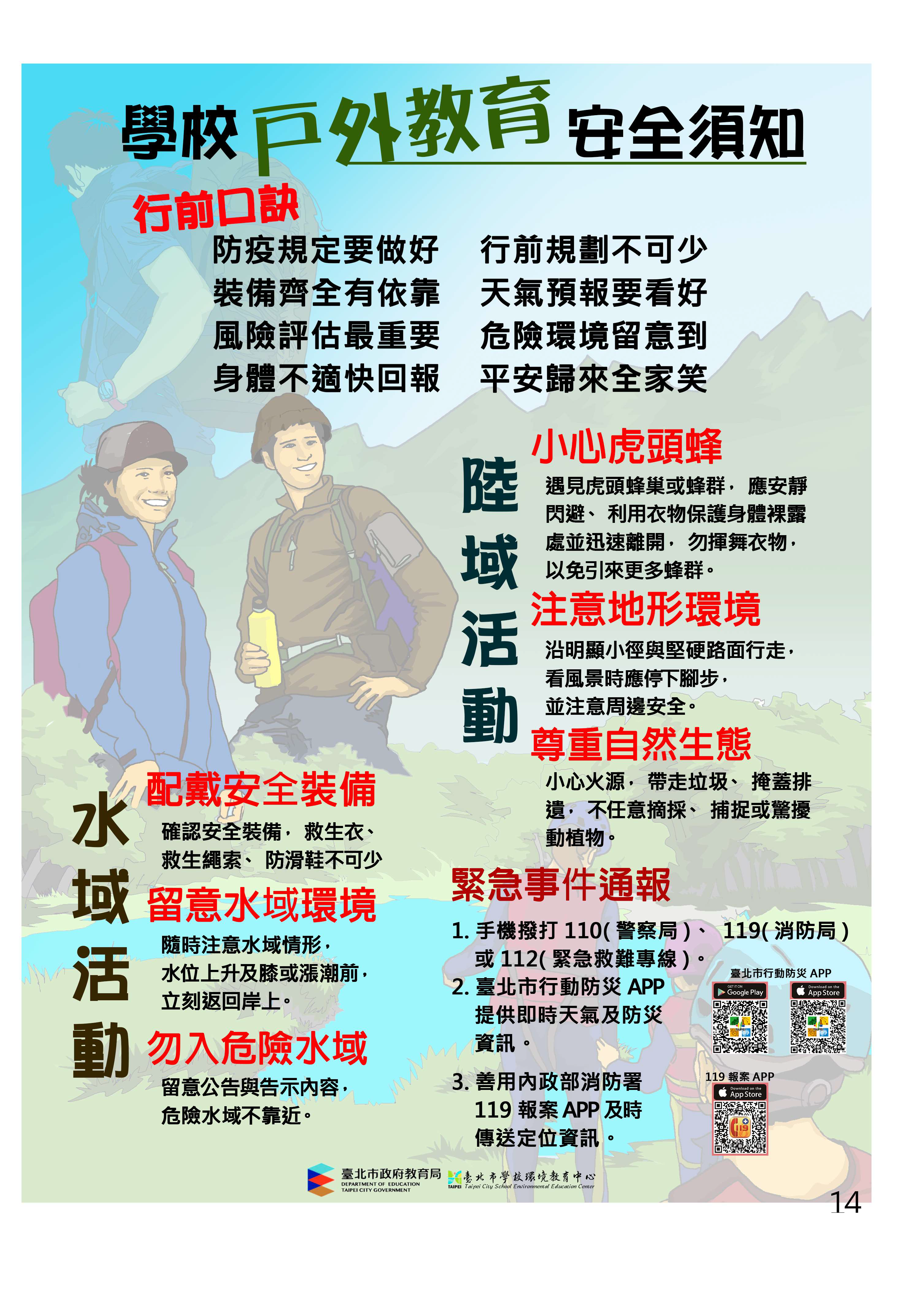 二、為提醒親師生戶外活動安全注意事項,教育局針對主要常見戶外活動,如登山、露營、自行車、溯溪、獨木舟等編訂安全指引,內容主要以行前規劃、活動中注意事項及緊急事件處理三大層面進行重點提示,另亦將幼兒從事戶外活動注意事項編擬為幼兒篇提供家長參考運用。