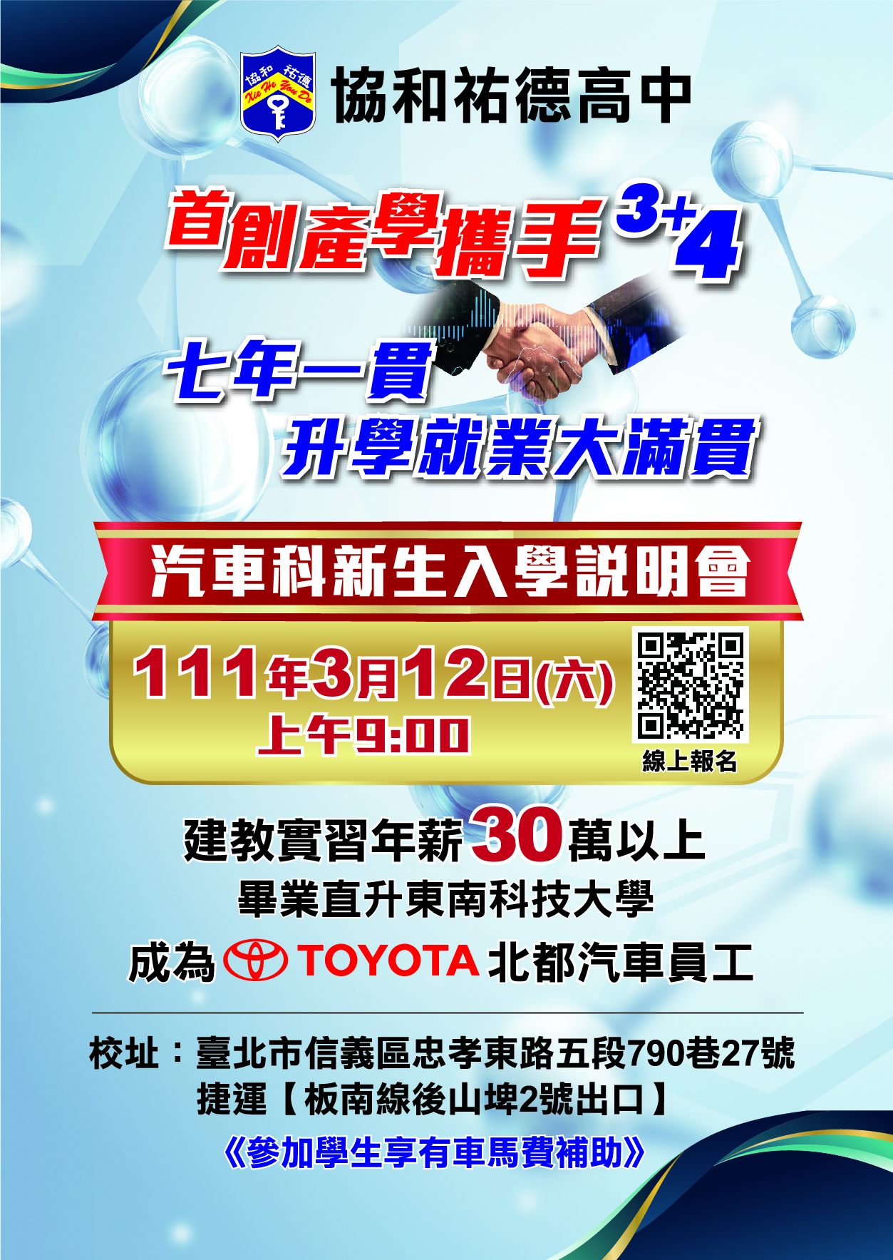 (一)汽車科優勢說明:建教實習年薪30萬以上、畢業直升東南科技大學、成為TOYOTA北都汽車正式員工。