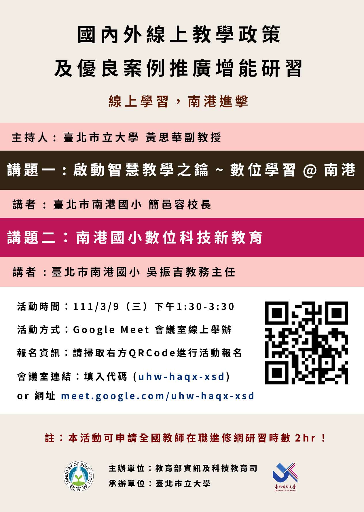 (一)研習時間:本(111)年3月9日(三)下午1時30分至3時 30分。