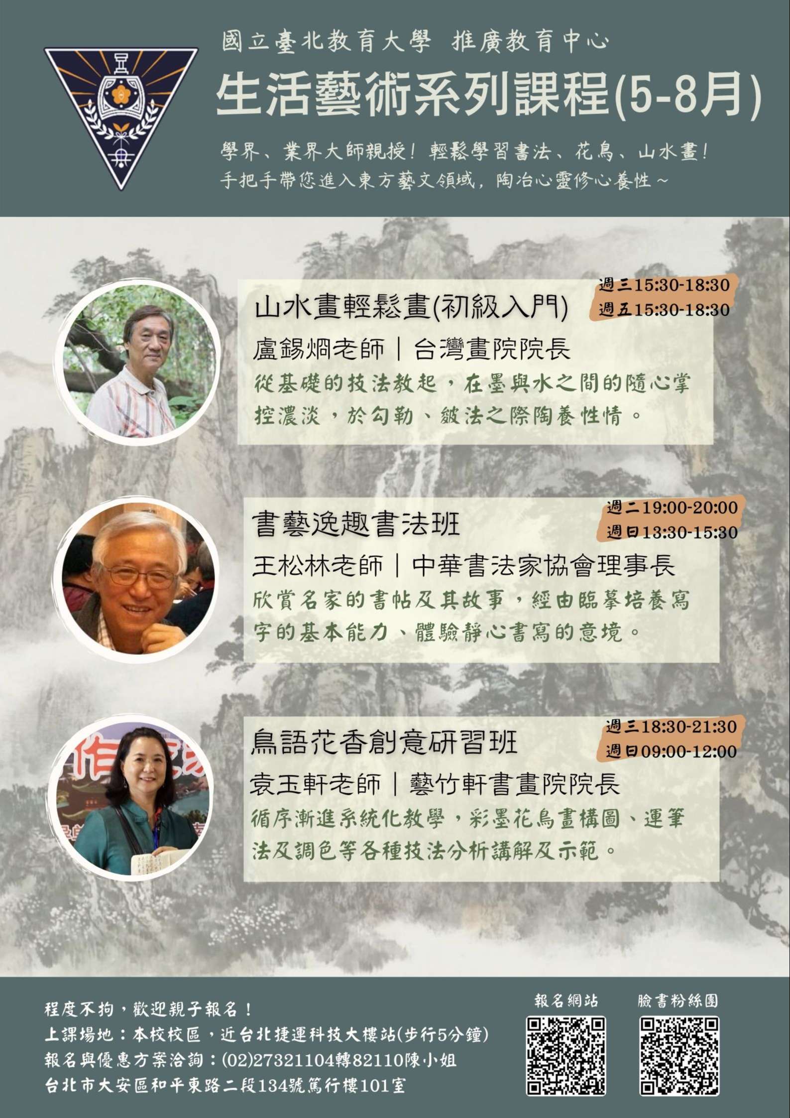 一、旨揭課程招生對象程度不拘,歡迎對書法、花鳥畫、山水 畫有興趣之人士報名參加。報名採線上辦理,課程資訊請 至本校推廣教育中心招生頁面查詢(https://cce.ntue. edu.tw/onenews/112)。