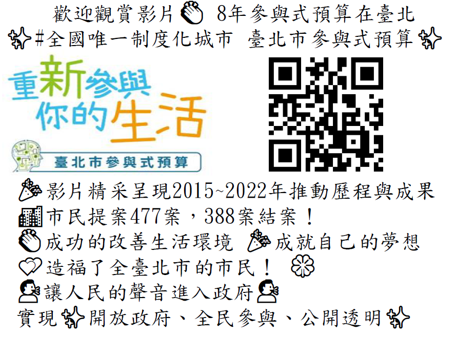 臺北市是首創將參與式預算制度化推動的城市,影片精采呈現2015~2022年提案人提案感想及推動歷程與成果,市民提案477案,388案結案,民眾成就自己的夢想,讓臺北市更美好,實現開放政府、全民參與、公開透明理念。