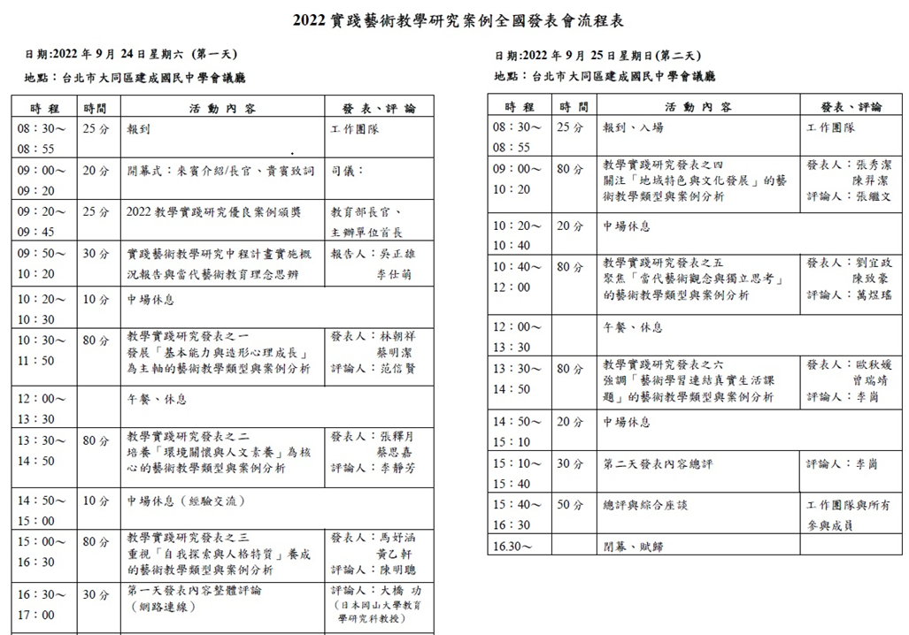 (二)發表方式由本計畫資深成員分析計劃理念與目標,歸納 當代視覺藝術教育的不同教學型態,以歷年教學實踐研 究的代表性案例進行對照提出報告,並邀請計畫諮詢委 員擔任評論人對發表內容提出分析意見,再共同對應現 場提問及研討,詳細活動流程與內容請參閱:附件一 《2022全國發表會流程表》
