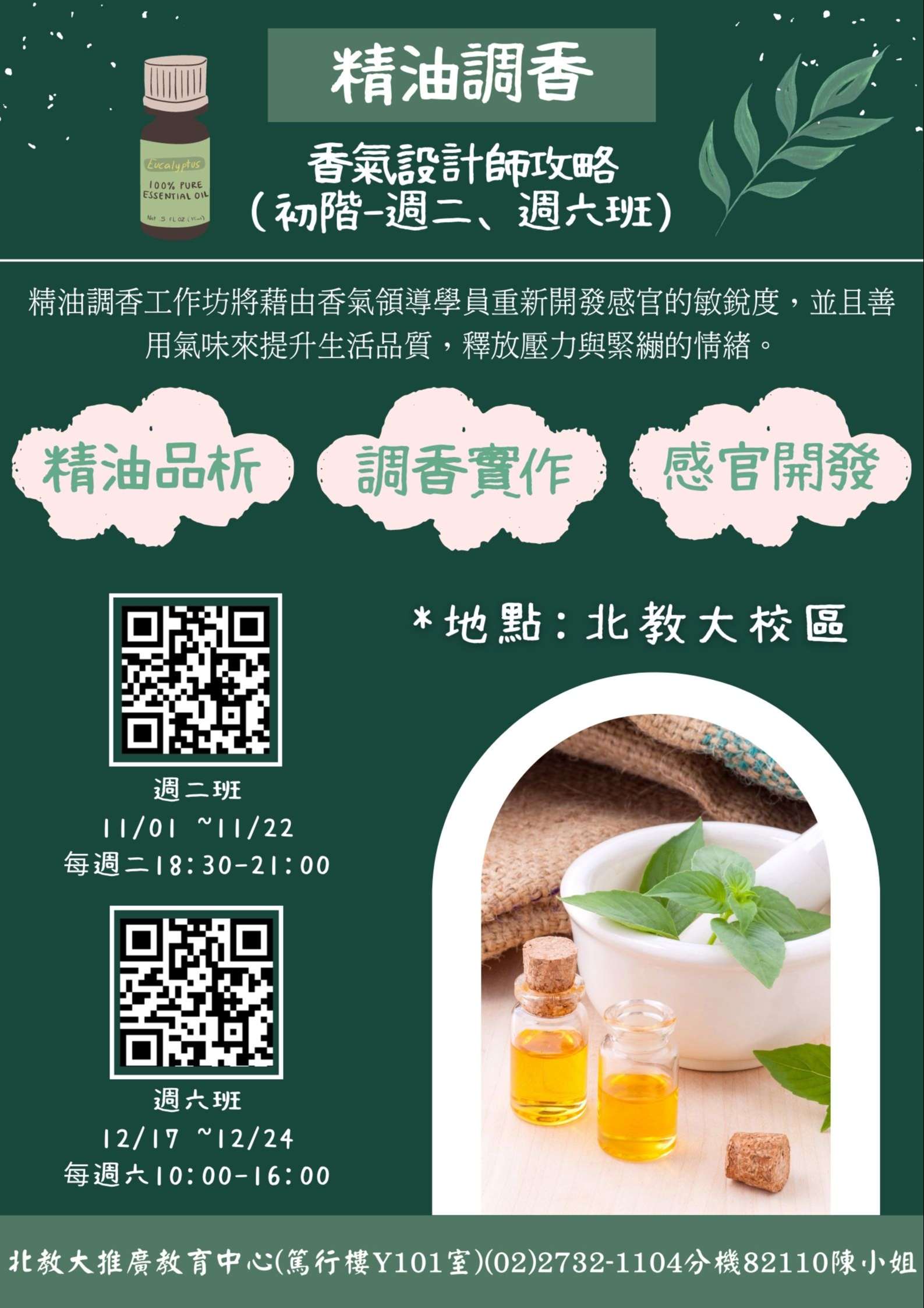 四、精油調香-香氣設計師攻略:課程將藉由香氣領導學員重新 開發感官的敏銳度,並且善用氣味來提升生活品質,釋放 壓力與緊繃的情緒。課程時間為每週六10:00-16:00(日期 111/12/17-111/12/24),共10小時。