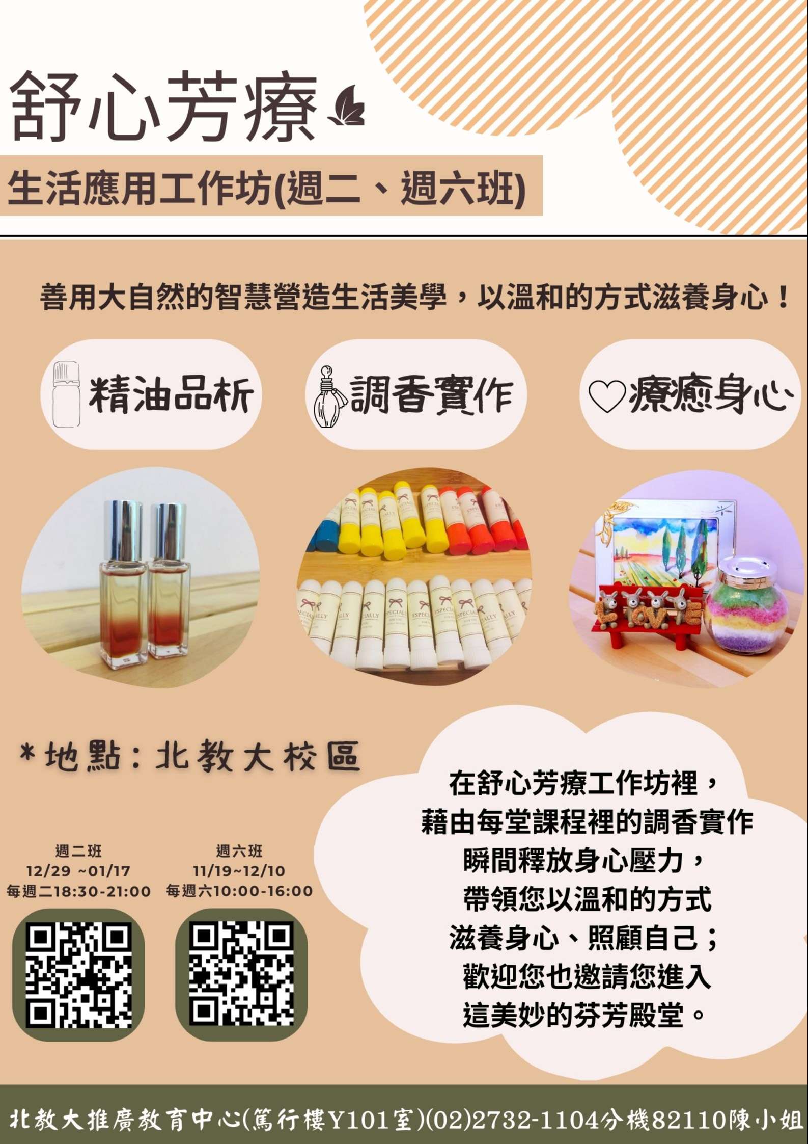 三、舒心芳療-生活應用工作坊:課程內容包含居家美學、肌膚 保養、痠痛呵護、情緒照護以及疲勞應用等,藉由每堂課 程裡的調香實作瞬間釋放身心壓力。課程時間可選擇週二 晚間18:30-21:00 (日期111/11/29 112/1/17),或週六10: 00-16:00(日期111/11/19-111/12/10),每梯次共20小 時。