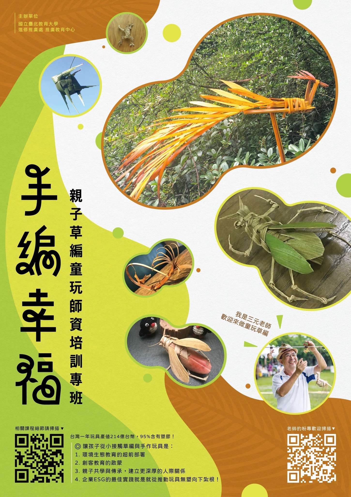 一、草編幸福-童玩技藝師資培訓:112年4月8日週六9:00-16: 00共6小時,全勤並通過評核將核發研習證明書。課程特聘 專業草編達人「草編CEO林三元老師」親授,包含戶外採 集、戶外與教室型態的教學示範、草編文化歷史理論介 紹,豐富多樣的內容不藏私分享,歡迎18歲以上對草編童 玩有興趣之教師或一般民眾報名。