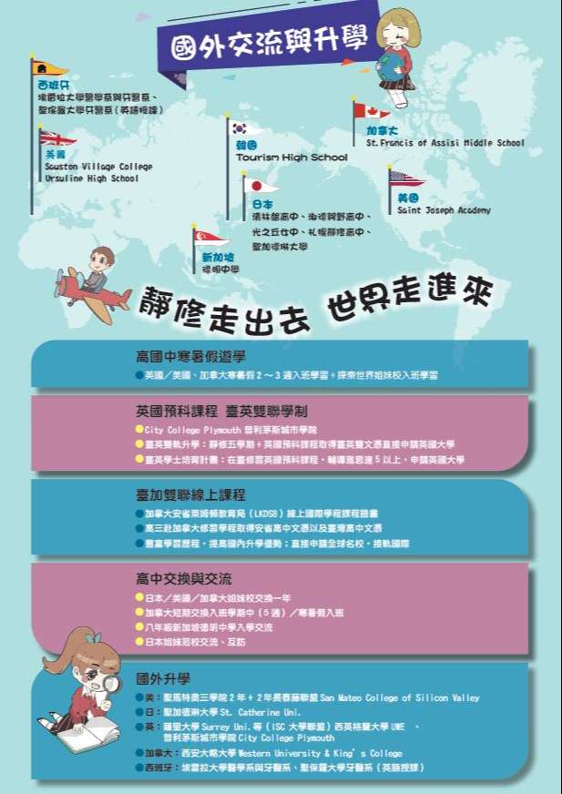 三、112學年度靜修高中設有高中部(升學班、雙語菁英班)、 高職部(應用英語科、應用日語科、商業經營科)。可輔 導學生海外升學至日本、加拿大、美國、英國及西班牙等 國。並推動臺英雙聯學制、臺加雙聯線上課程。