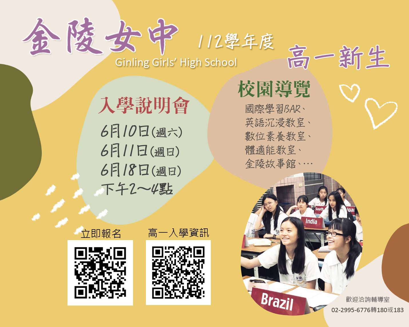 一、本校通過國教署擴增雙語實驗班計畫,設有臺美雙聯學 制,並輔導升學美國、英國、澳洲及直升荷蘭阿姆斯特丹 大學、英國薩里大學。為提供國三家長及學生,了解金陵 教育理念及特色課程,特辦理校園參訪暨說明會,敬請協 助公告並鼓勵踴躍報名。