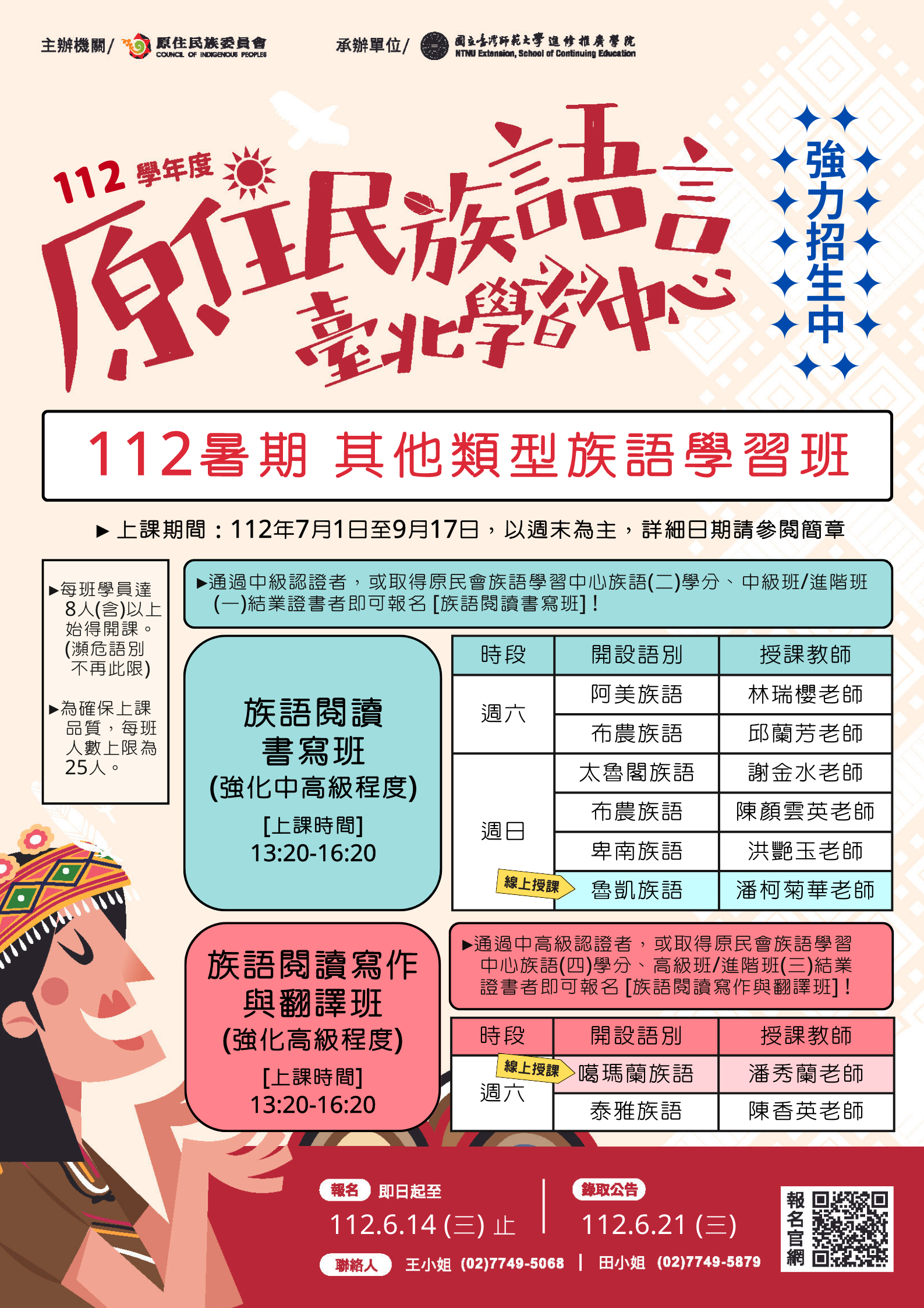 二、為使更多人認識原住民族文化及加強族語能力,臺師大原 住民族語言臺北學習中心特辦理「原住民族語言學習 班」,藉以傳承並推廣原住民族語言及文化,培育更多通 曉原住民族語之人才。