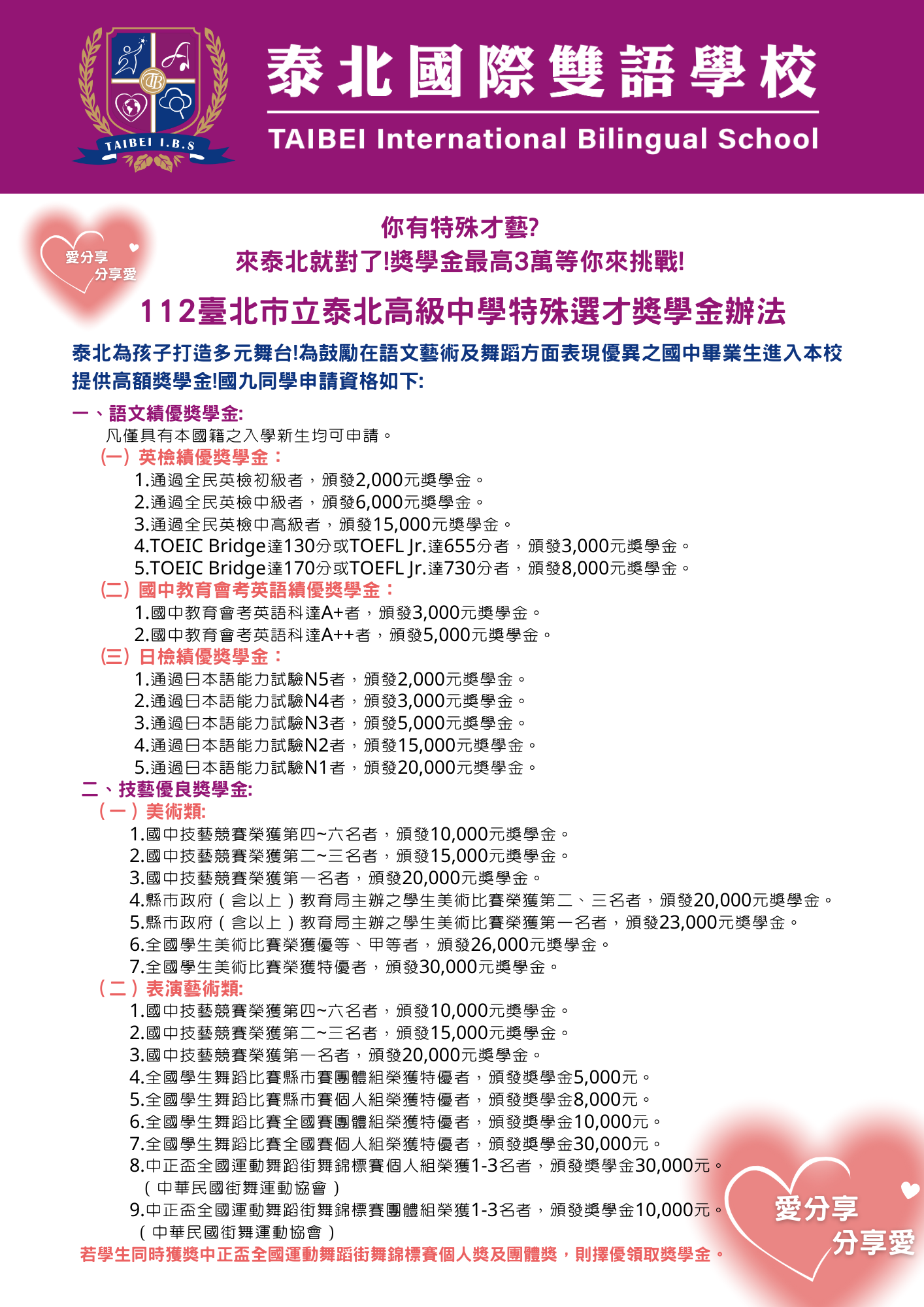 檢送本校112學年度新生入學暨家長說明會實施計畫與特 殊選才獎學金辦法,敬請惠予協助公告周知,並鼓勵所屬 學生家長踴躍參與,請查照。