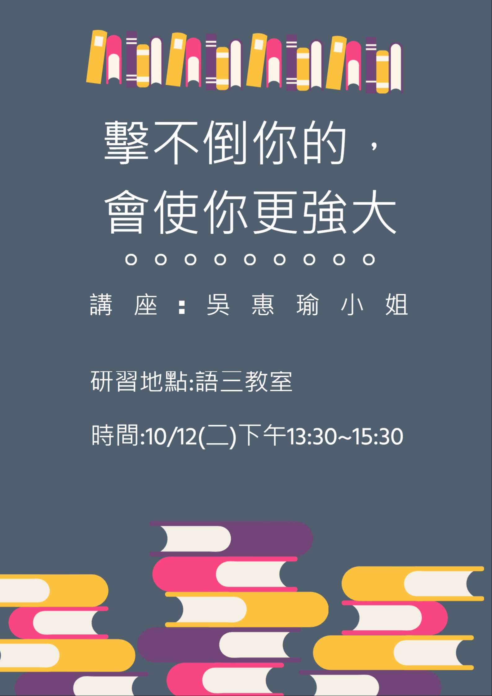 一、 本校將於10/12(四)下午國文領域時間13:30~15:30聘請前英代爾台灣區總經理吳惠瑜小姐擔任講座,主題為「擊不倒你的,會使你更強大。」。