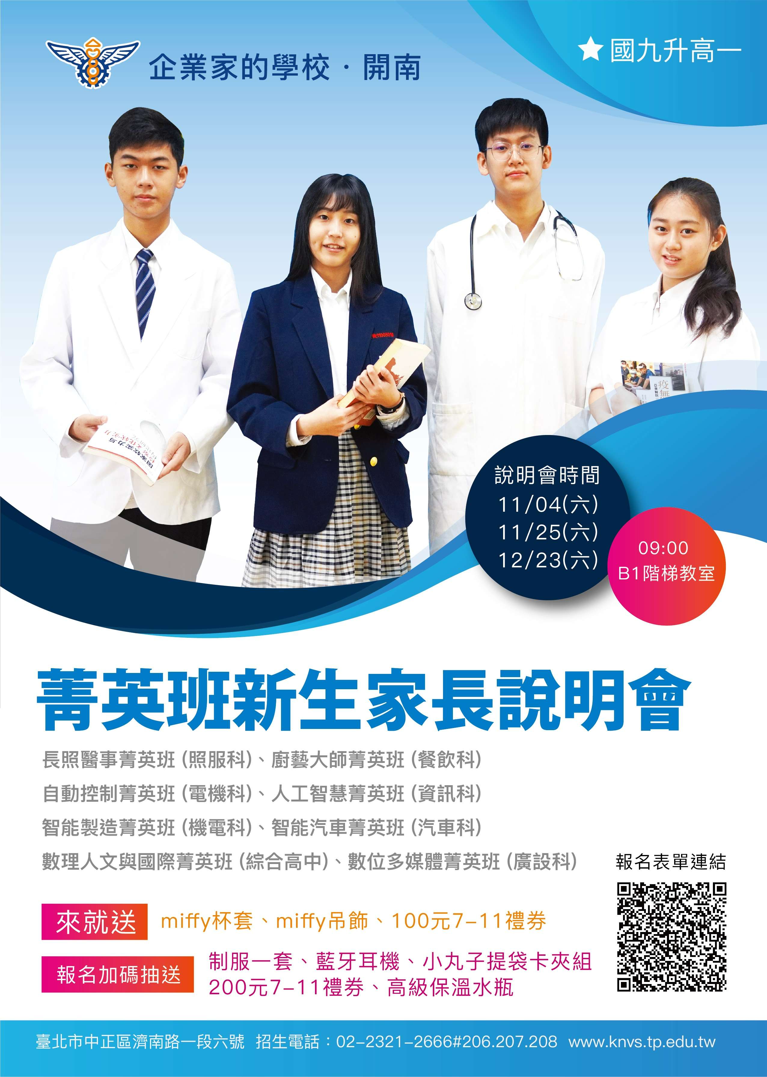 二、本校於112年11月4日、11月25日、12月23日(星期六)上 午09:00~11:30辦理「菁英班新生家長說明會」,隨函 檢送「菁英班說明會海報」,特邀請 國九家長暨子弟參 加,敬盼 師長能協助公告於貴校官網,報名網址如下: