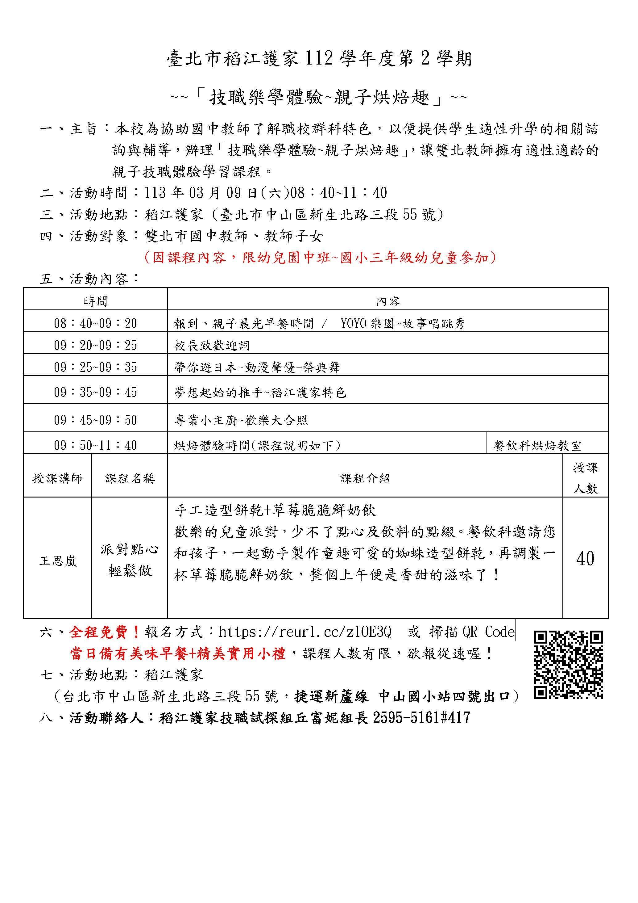 二、本學期於113年3月9日(六)上午8:40-11:40,辦理「技職 樂學體驗~親子烘焙趣」,讓雙北市教師擁有適性適齡的親 子技職體驗學習課程。誠摯邀請 貴校教師及輔導學生升 學相關行政人員踴躍報名參加,全程免費。