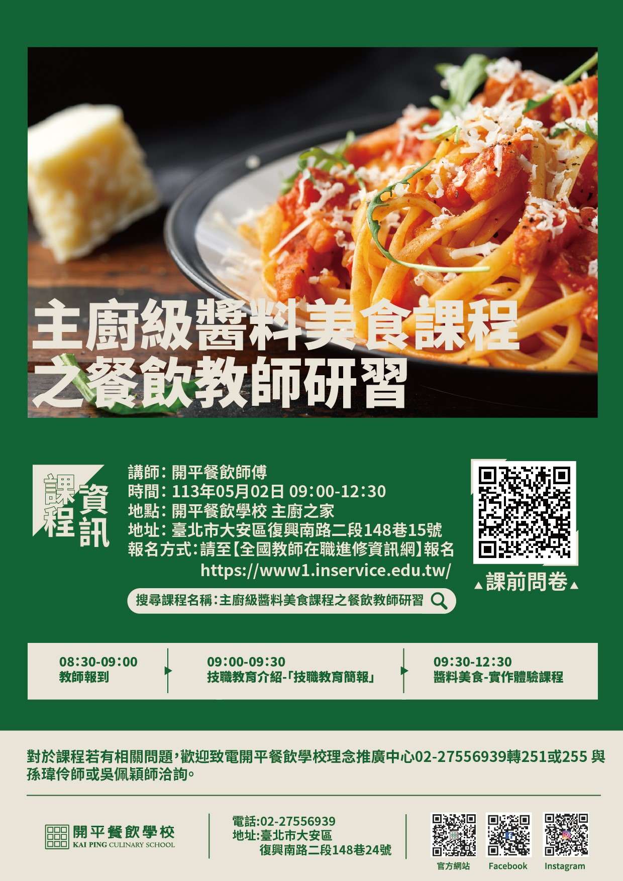 四、報名方式:採線上報名,請上”全國教師在職進修資訊網” 報名,課程名稱:主廚級醬料美食課程之餐飲教師研習; 研習代碼:4311080。報名截止日期:113年4月30日 (二)課程名單將於開課前三天確認遴選名單。