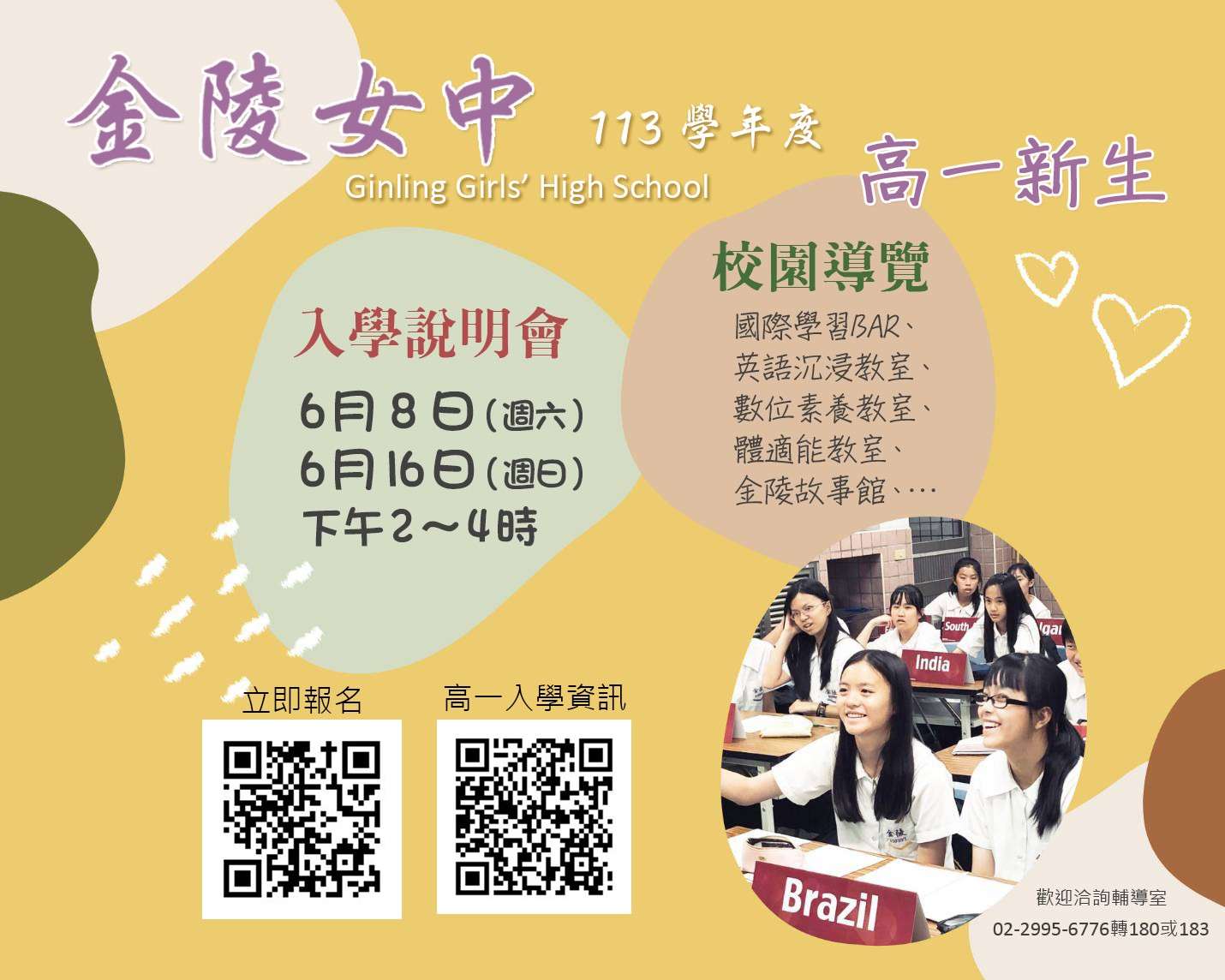 一、本校通過國教署擴增雙語實驗班計畫,設有臺美雙聯學 制,並輔導升學美國、英國、澳洲及直升荷蘭阿姆斯特丹 大學、英國薩里大學。為提供國三家長及學生,了解金陵 教育理念及特色課程,特辦理校園參訪暨說明會,敬請協 助公告並鼓勵踴躍報名。