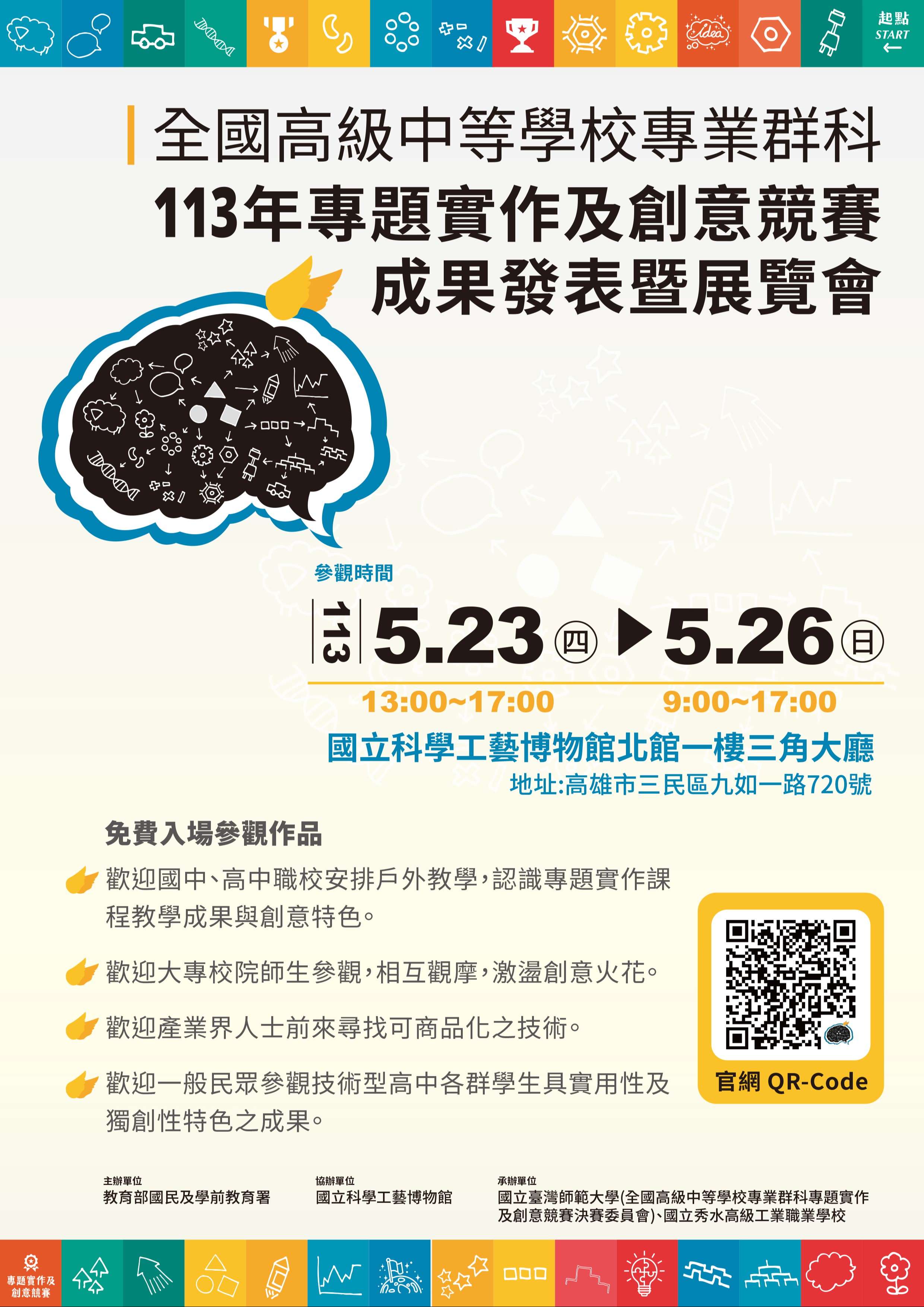 二、旨揭活動係展出全國技術型高中113年專題實作及創意競賽 「專題組」及「創意組」15群第1名作品,展現技術型高中 學習成果;展示方式包括實體展示及現場解說,由獲獎學 生親自說明如何經由作品發揮創意,與日常生活或產業結 合。