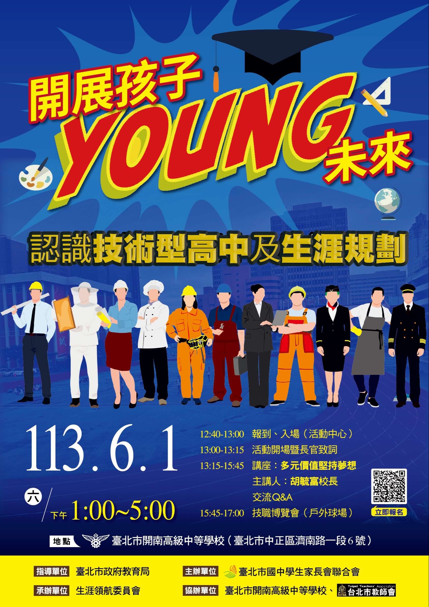 為本市國中學生家長會聯合會辦理「認識技術型高中及生 涯規劃~開展孩子young未來~」活動一案,請鼓勵貴校師 生及家長參與,請查照。