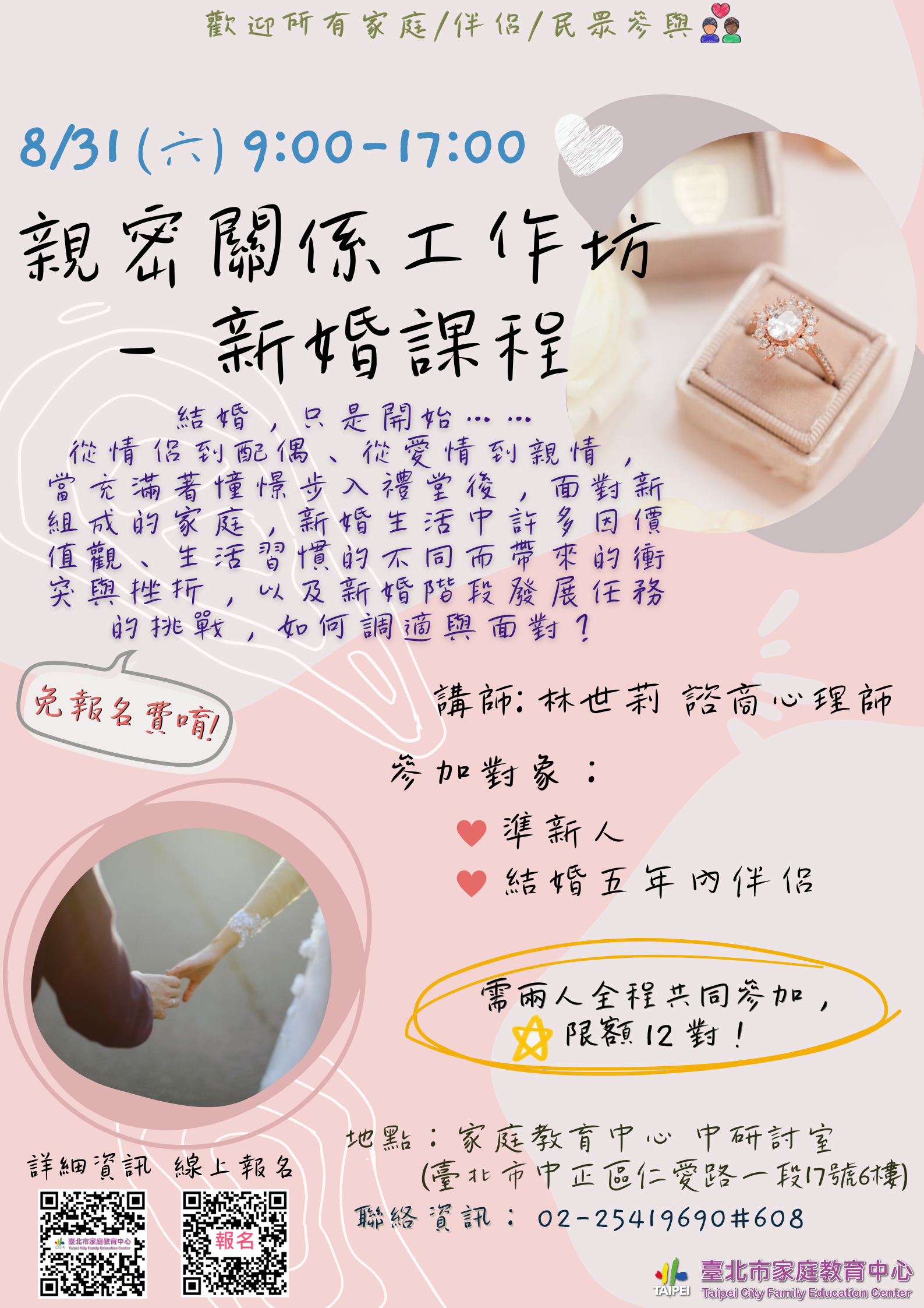 報名自即日起至113年8月25日止,限額12對(24人),額 滿採候補登記制,相關內容可於中心網站( https://family.gov.taipei/)課程與活動瀏覽、下載。
