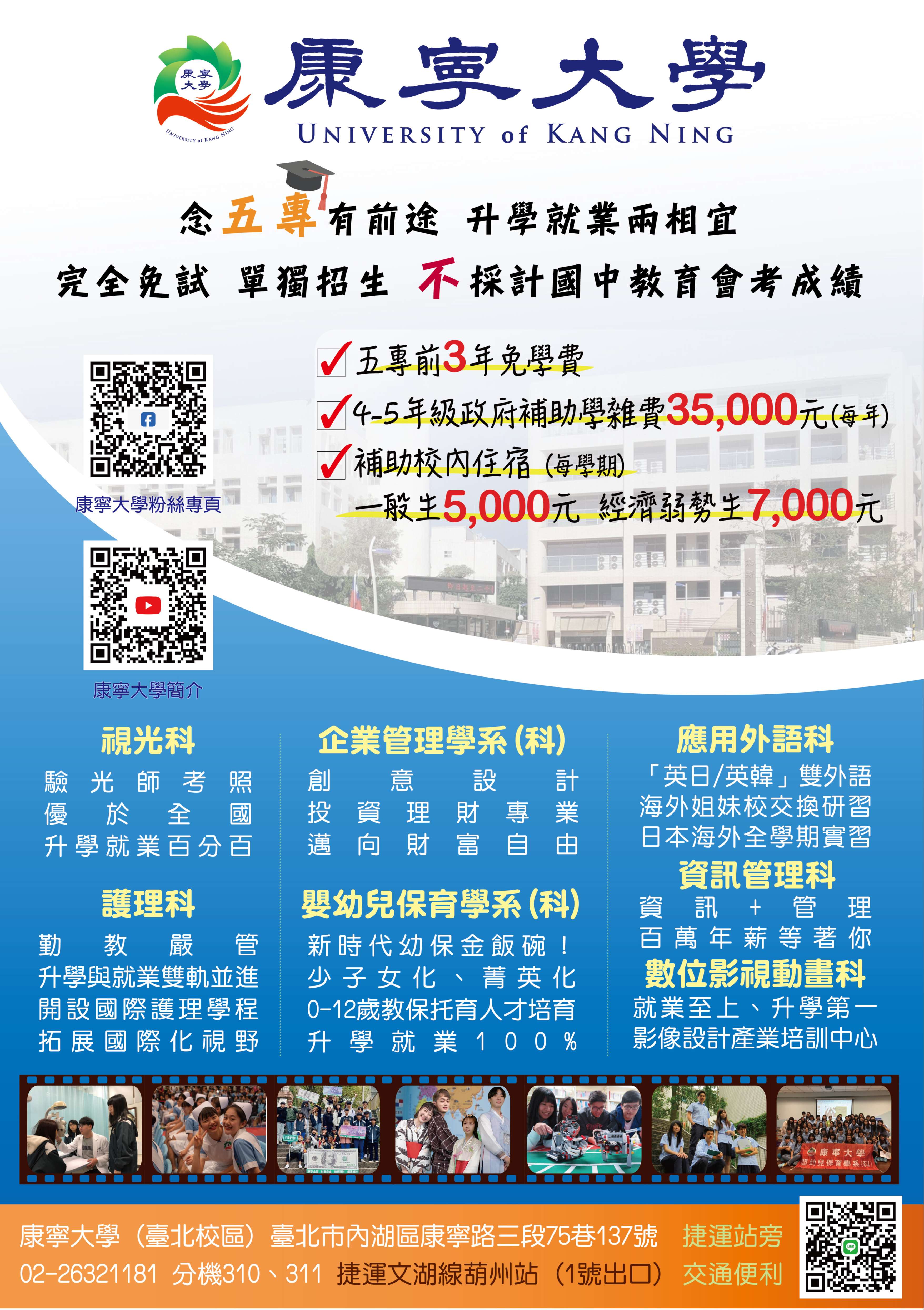 四、聯絡人資訊:康寧學校財團法人康寧大學教務處招生中心 高惠玲主任 聯絡電話:(02)2632-1181分機310;0916-051-882 E-mail:shirly02@g.ukn.edu.tw Line ID:shirlykao945945