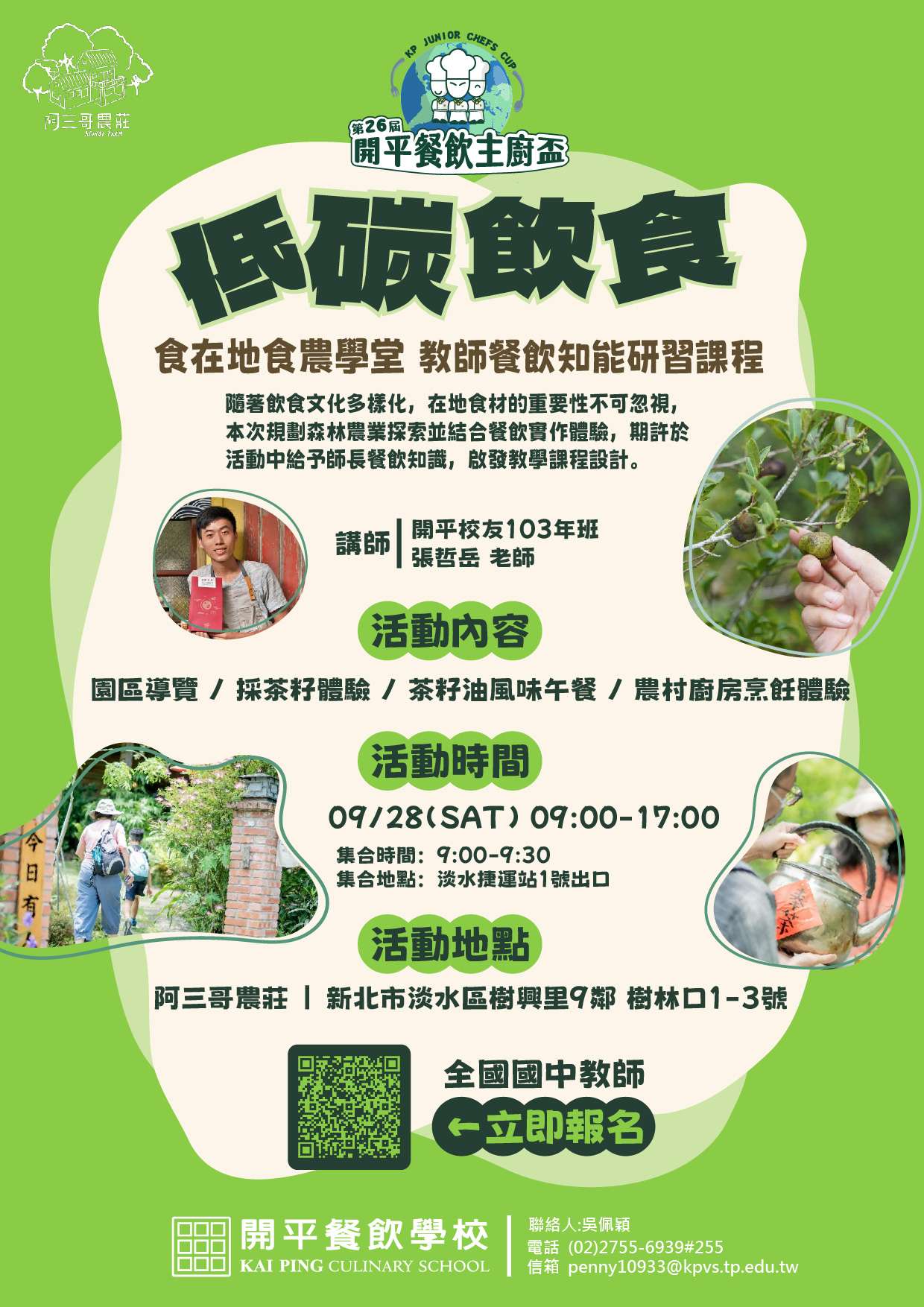 檢送本校辦理「開平餐飲學校113學年度國中教師技職教 育研習_食在地食農學堂-教師餐飲知能研習課程」實施計 畫乙份,請鼓勵所屬踴躍報名,請查照。
