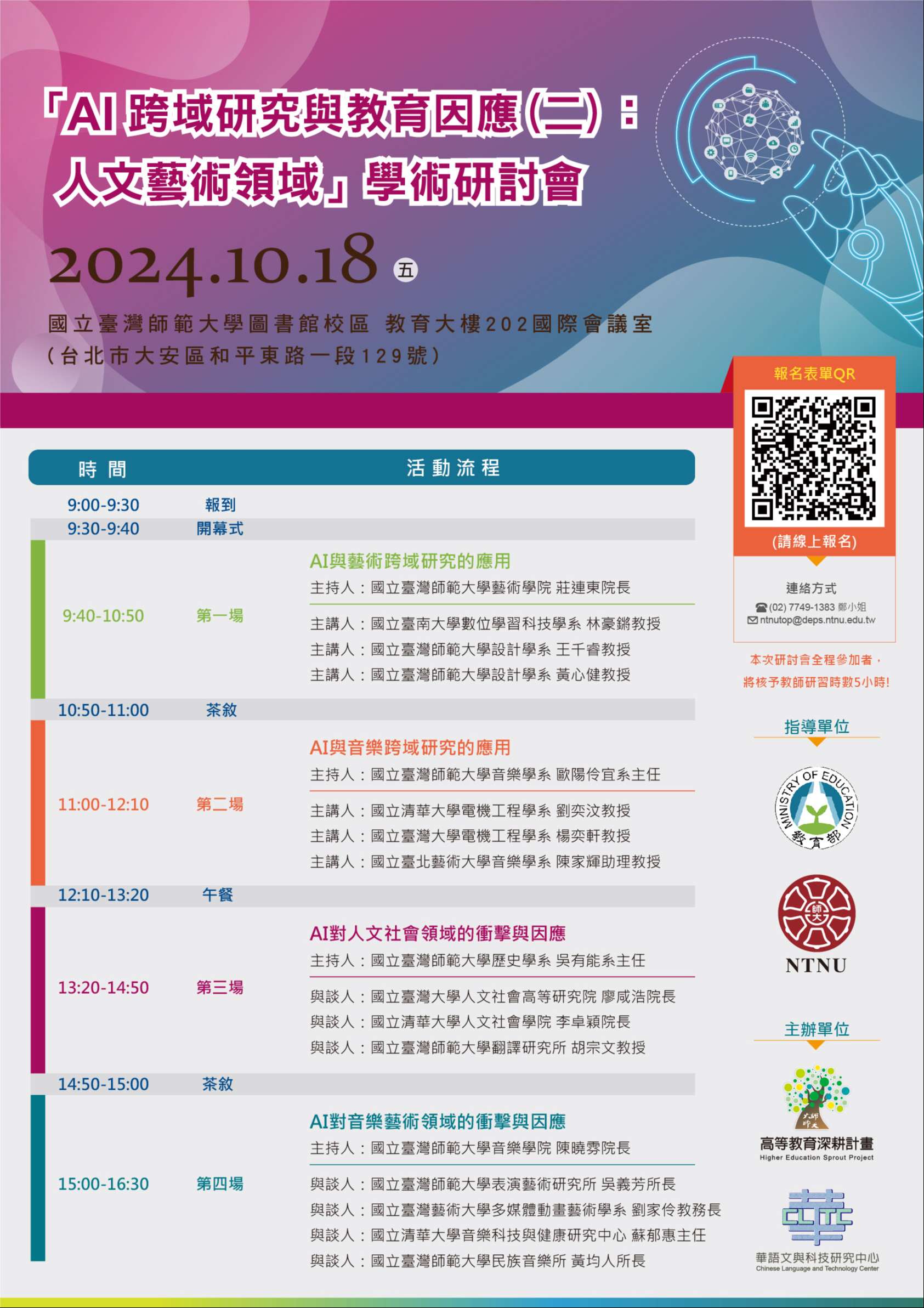 一、旨揭研討會邀請各領域專家學者對談,探討人工智慧在人 文和藝術領域的應用,以及對當前高等教育帶來的影響, 共同反思教與學的因應策略。
