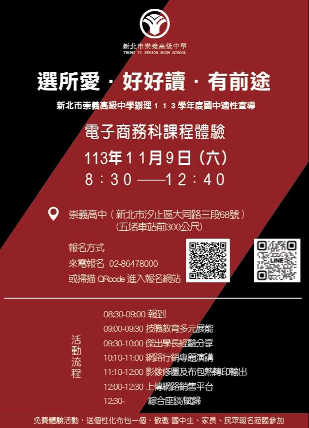 本校辦理「選所愛、好好讀、有前途-新北市113學年度 國中家長適性宣導活動」,歡迎各校同學與家長踴躍報名 參加。
