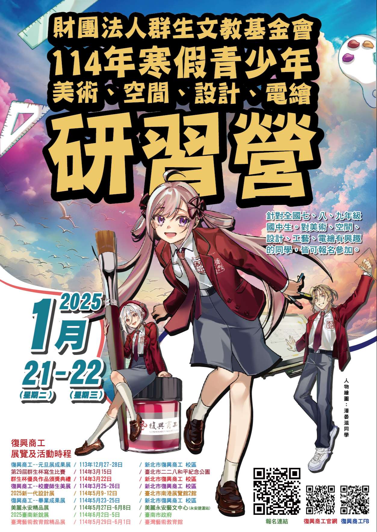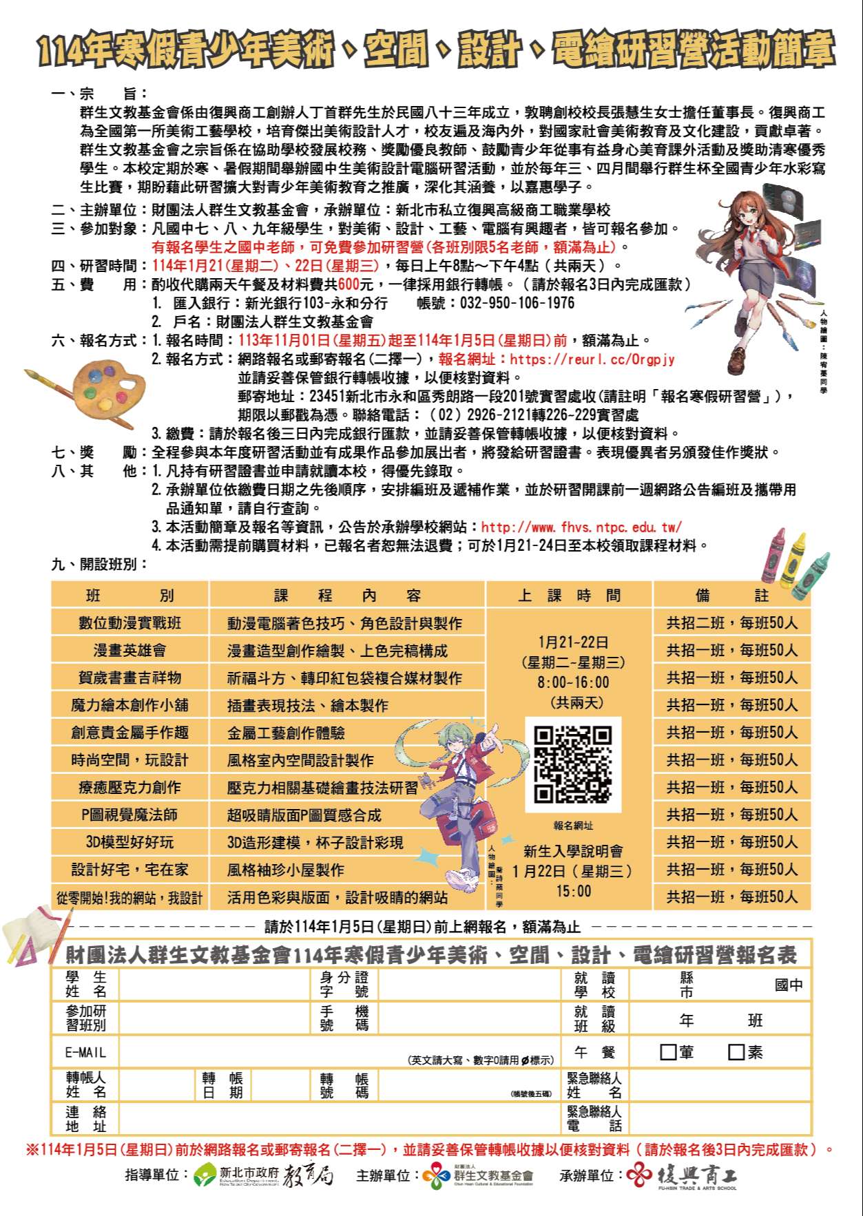 檢送本校承辦財團法人群生文教基金會「114年寒假青少 年美術、空間、設計、電繪研習營」活動簡章,敬請 惠 予宣導,鼓勵學生踴躍參加,請查照。