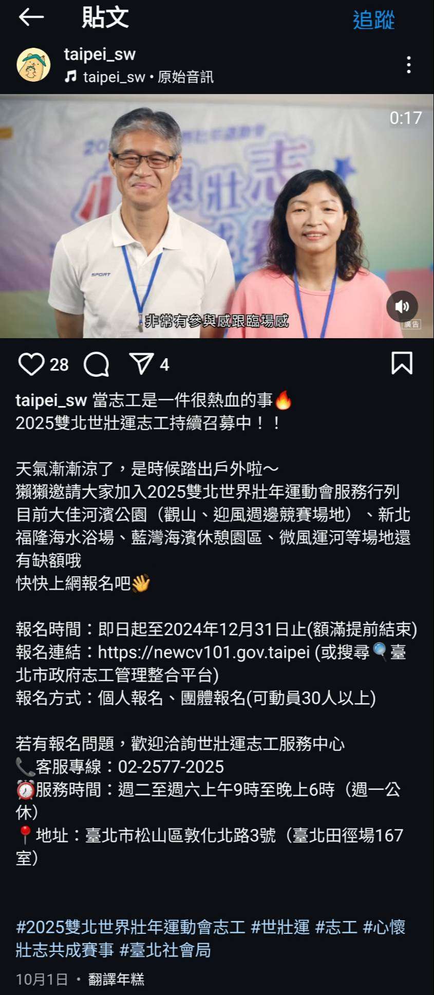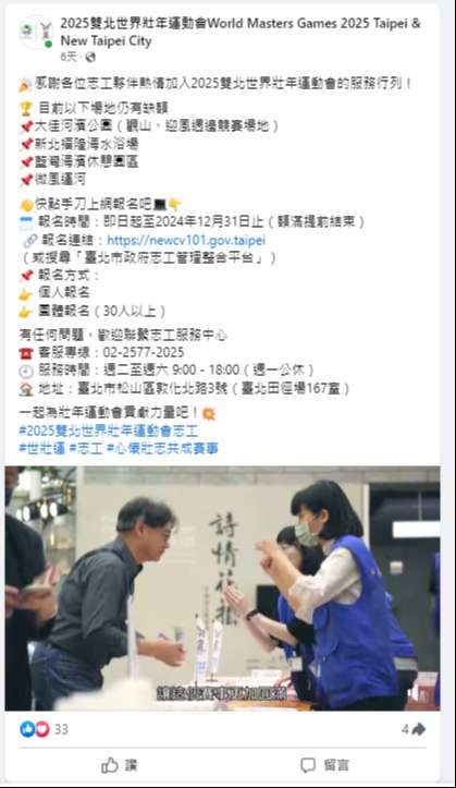 二、截至113年10月上旬2025雙北世界壯年運動會志工報名人數 已達7,000人,為加強志工形象之建立,特此攝製志工形象 影片,希望藉此加深觀看者對於2025世壯運賽會與世壯運 志工之印象,維持賽事熱度。