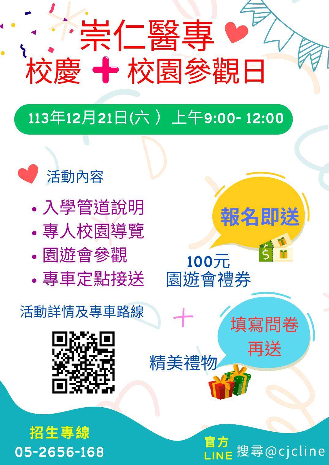 擬邀請貴校師生及家長蒞校參加崇仁醫專校慶暨校園參觀 活動。