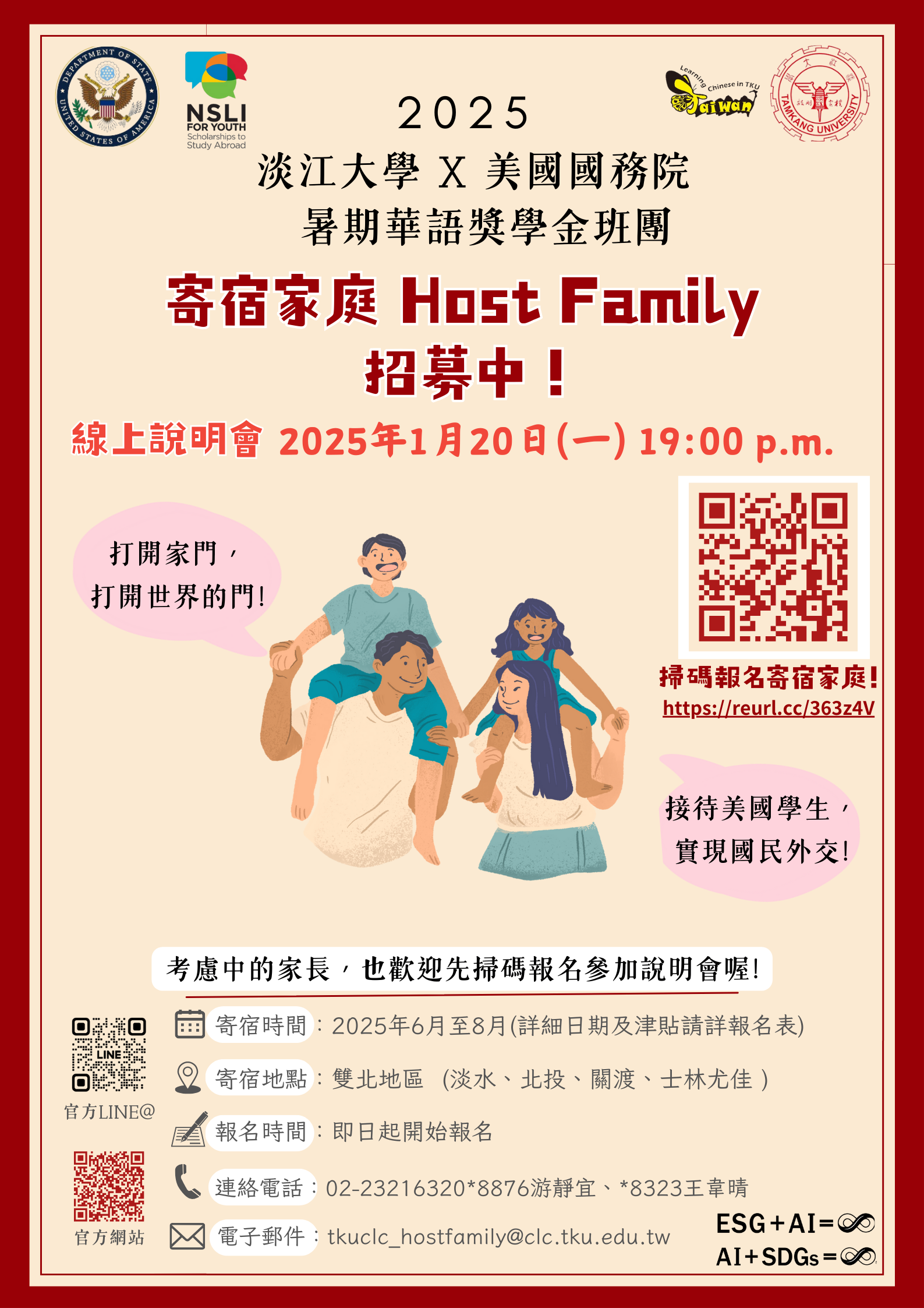 [徵選寄宿]淡江大學推廣教育處華語中心承辦2025年暑期「美國國務院華語獎學金研習班」徵選臺灣寄宿家庭,檢送招募海報,歡迎踴躍報名