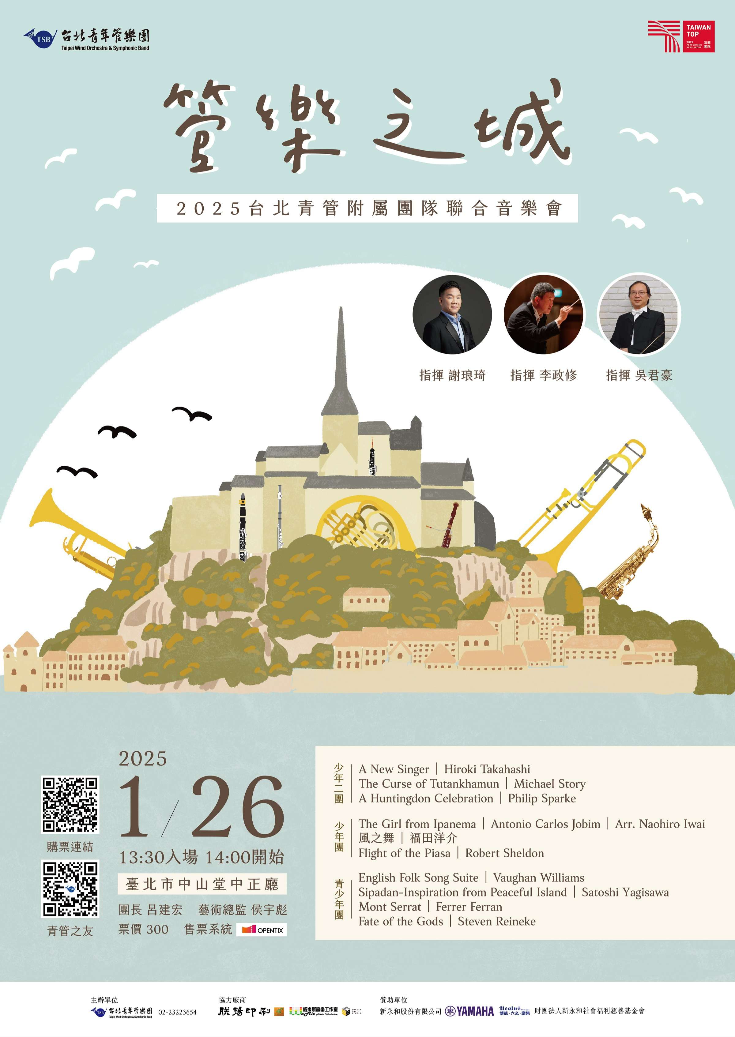 一、2025台北青管附屬團隊聯合音樂會,由謝琅琦、李政修與吳君豪3位老師,指揮台北青管附屬團隊演出,帶來一連串耳熟能詳的管樂經典曲目。