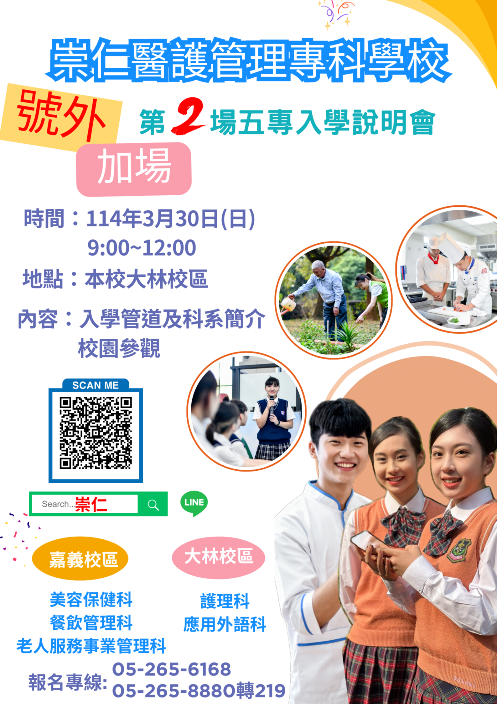 本校於114年3月30日(星期日)辦理第二場五專入學說明會,敬請協助公告活動訊息。