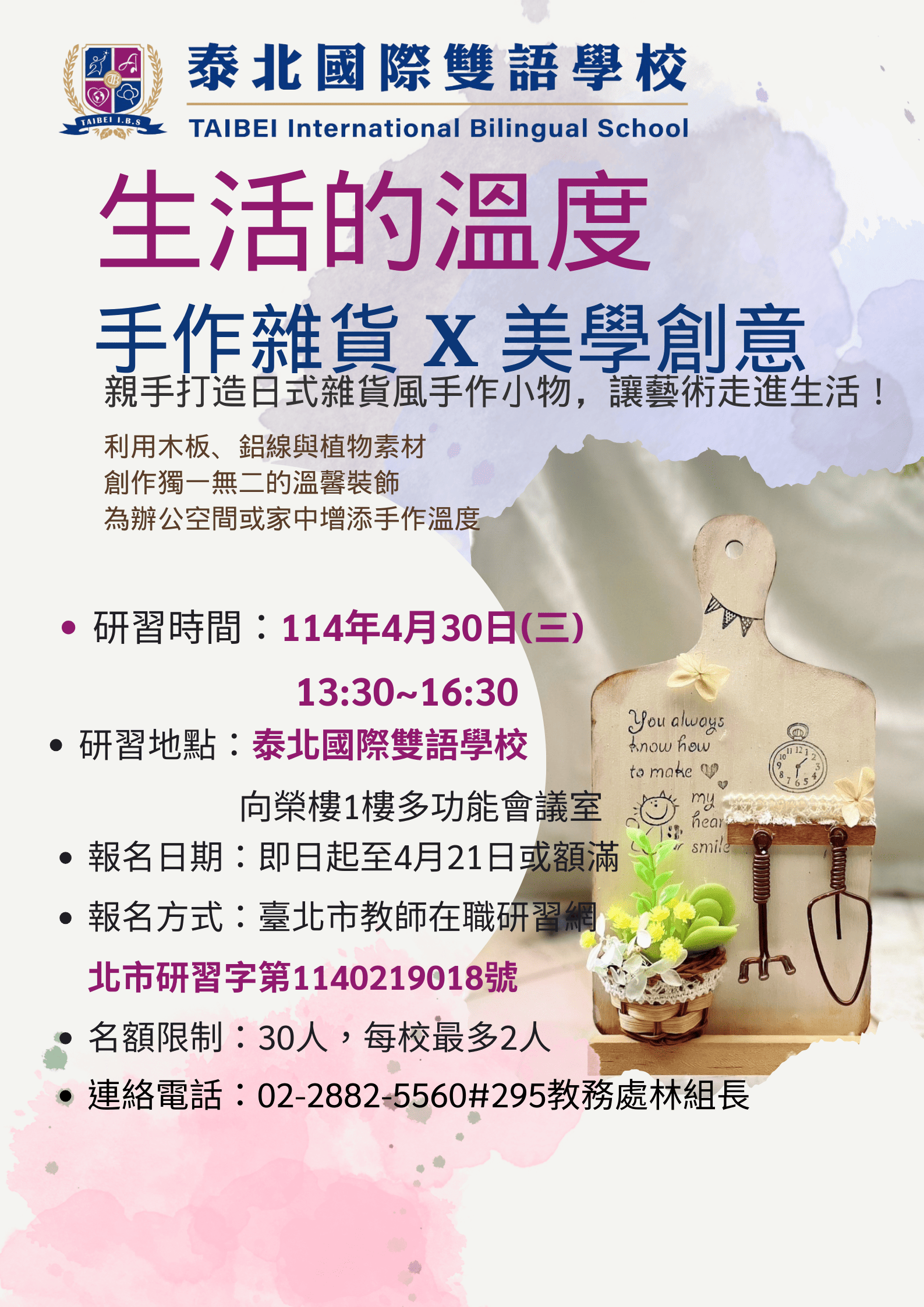 用-生活的溫度:手作雜貨 X 美學創意」教師研習,敬邀貴校教師踴躍報名參加。