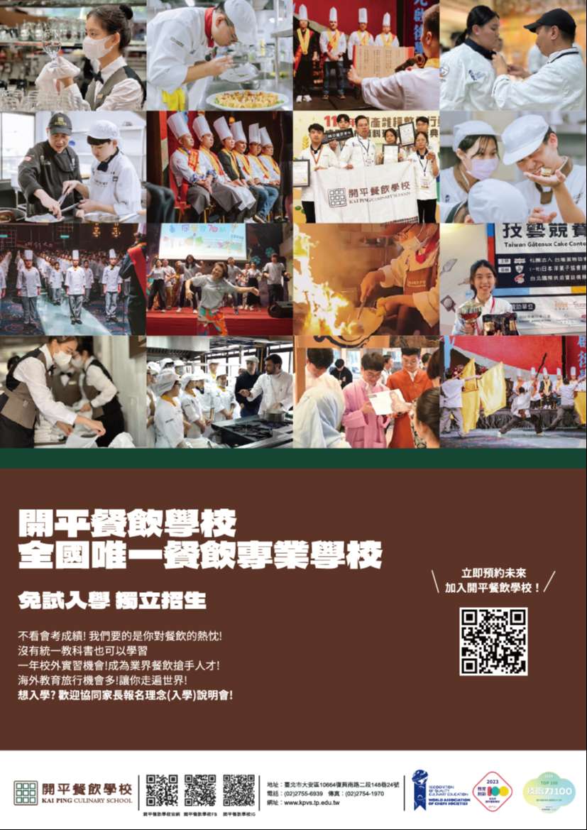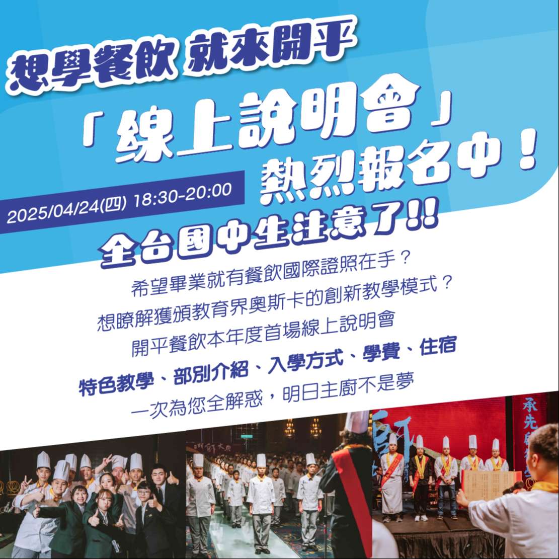 一、為使更多國中學生對技職教育深入瞭解,本校辦理「實體 理念說明會」及「線上理念說明會」,提供學生、家長認 識本校教育理念與餐飲教學特色,協助增進國中學生及其 家長對職業類科升學管道及學習內容之試探,期望開平優 秀學子成為臺灣及國際餐飲界之人才。