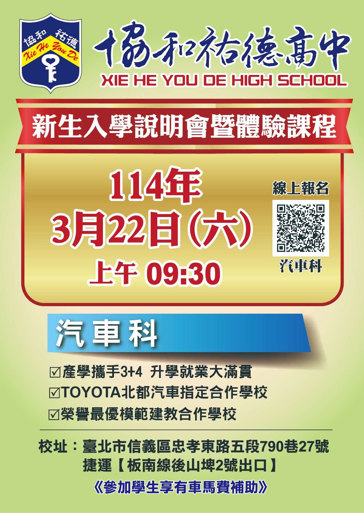 檢送本校辦理「汽車科-技職特色、體驗課程」說明會, 敬請惠予公告,並轉知貴校九年級學生踴躍參加。