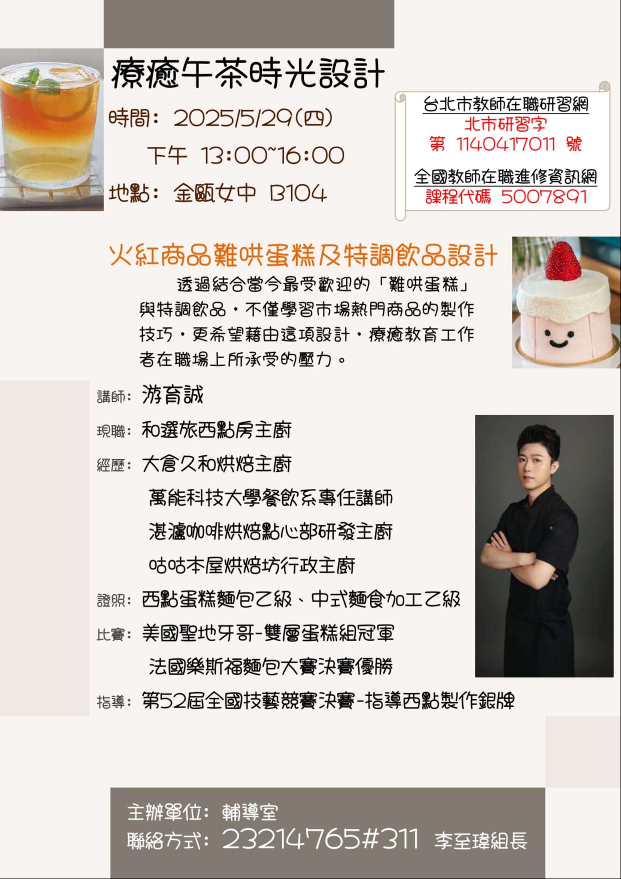 檢送本校「113學年度均質化技職深化研習活動實施計畫火紅商品難哄蛋糕及特調飲品設計」報名資訊及海報,請 惠予公告周知,敬邀貴校師長報名參與,請查照。