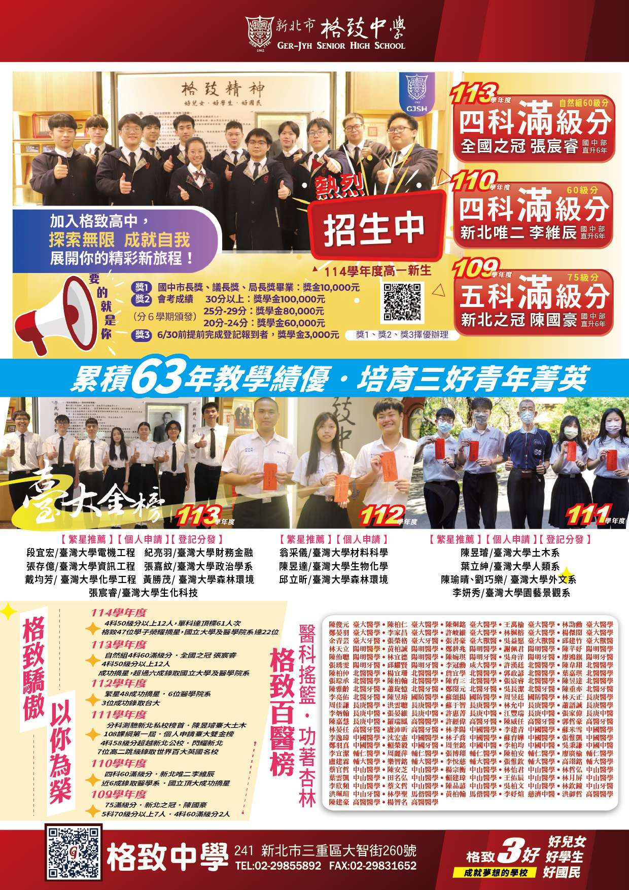一、格致高中114學年度高一招生以基北區免試入學(214名)管 道供九年級同學適性入學。