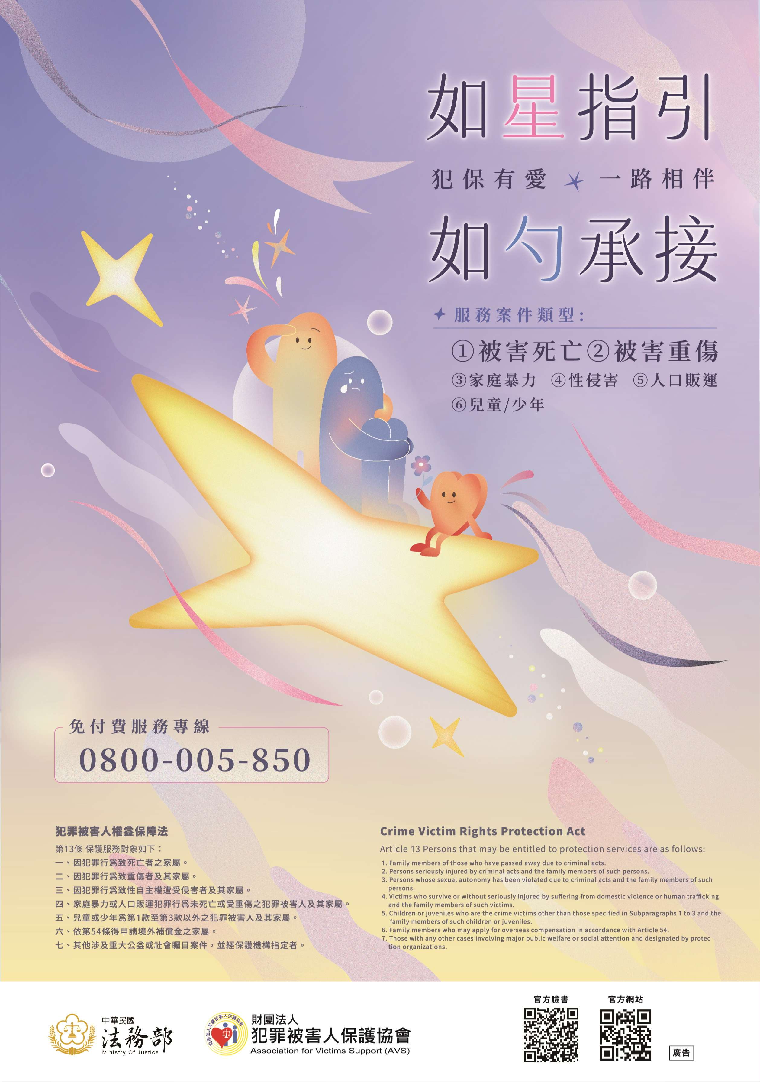 四、相關影片、海報等宣導素材均置於法務部全球資訊網「簡介/重大政策/犯罪被害人保護」頁面項下;財團法人犯罪被害人保護協會(下稱該會)亦將陸續上傳犯罪被害人權益保障業務最新宣導素材至該會網站(https://www.avs.org.tw/)「暖心出品」項下或粉絲專頁(https://www.facebook.com/avs0850),請自行下載運