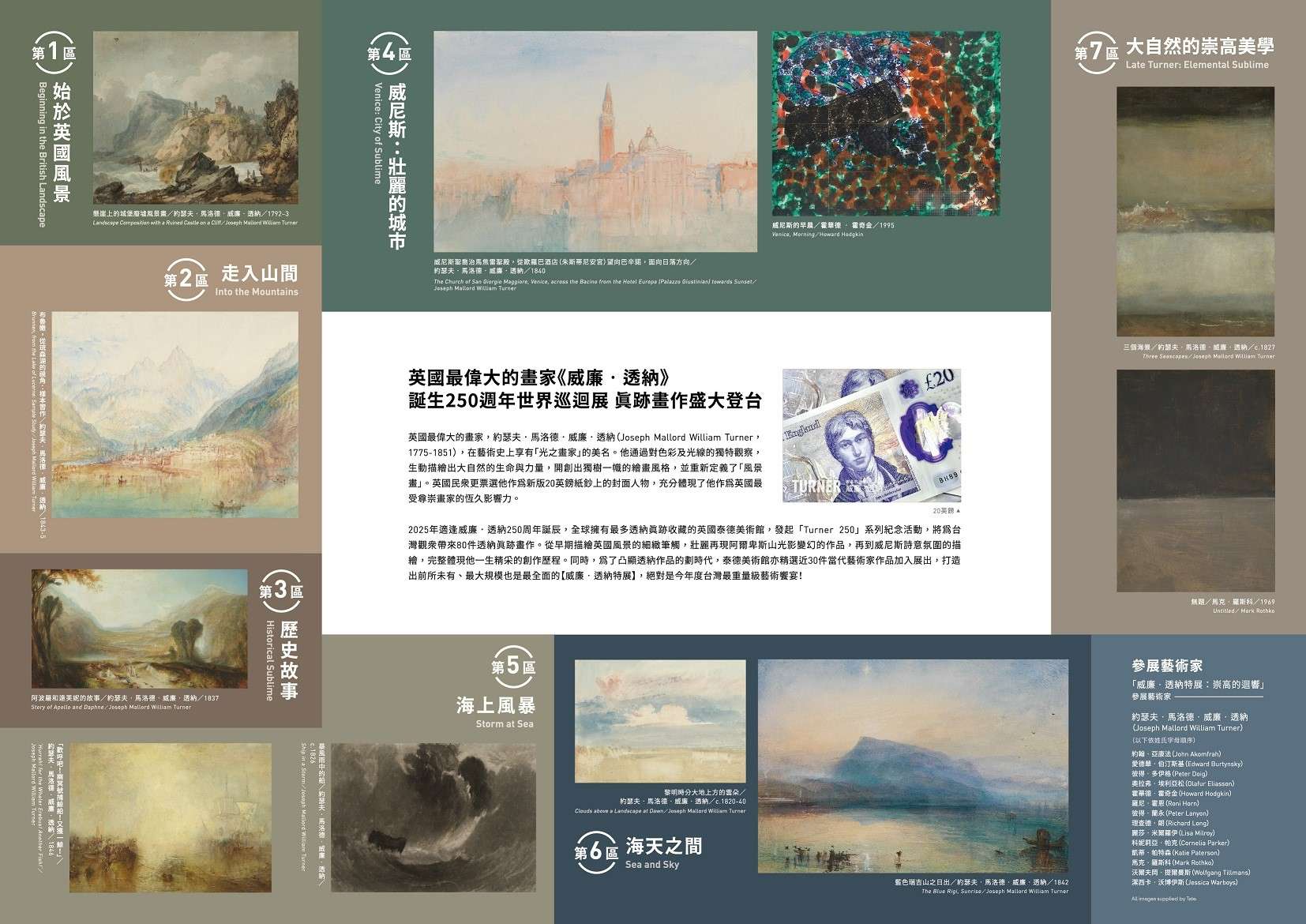 3、擁有最多透納作品收藏的泰德美術館,本次將帶來80 件透納的真跡畫作,以英國風景、阿爾卑斯山、威尼 斯、海上風暴、海天之間、歷史故事、崇高美學等, 分為7大展區,貫穿他整個創作生涯。為了凸顯透納作品的劃時代,泰德美術館另精選近30件當代藝術家作 品加入展出,打造出前所未有、最大規模也是最全面 的威廉.透納特展。