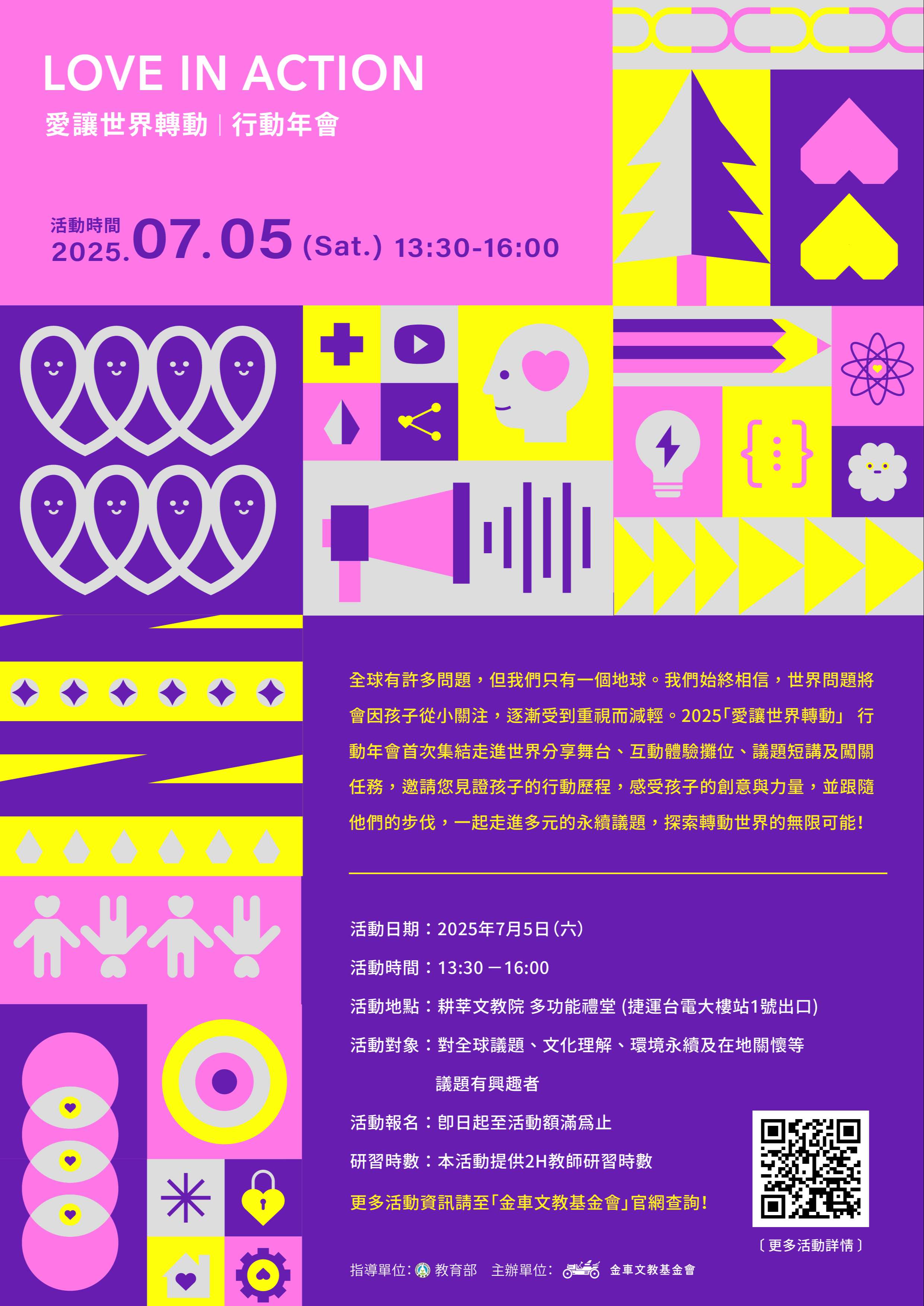 一、金車文教基金會長期推動「愛讓世界轉動」計畫,鼓勵老師陪伴孩子以國際視野、在地行動,走出教室落實社會關懷。2025「愛讓世界轉動」行動年會活動特別集結獲獎團隊師生行動成果,現場設有15個互動體驗攤位、4大議題專家短講及闖關任務等豐富活動,教您如何透過教學設計與課堂實踐,連結在地與國際重要的永續議題,打造有感的學習氛圍,攜手孩子走進地方、邁向世界。