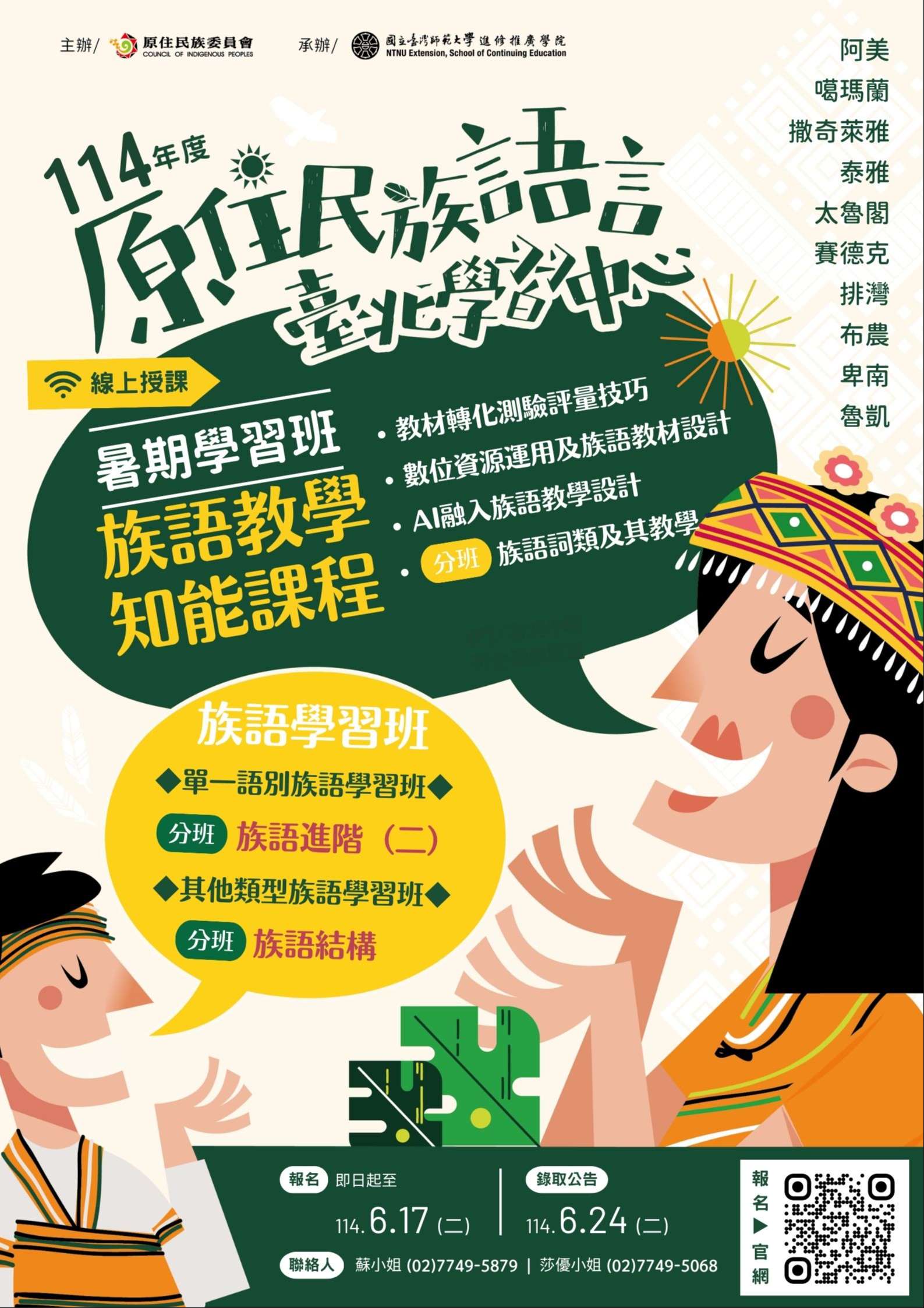 三、本班招生對象針對有意從事阿美族、噶瑪蘭族、撒奇萊雅族、泰雅族、太魯閣族、賽德克族、排灣族、布農族、卑南族、魯凱族等族語教學或語言推動工作者。