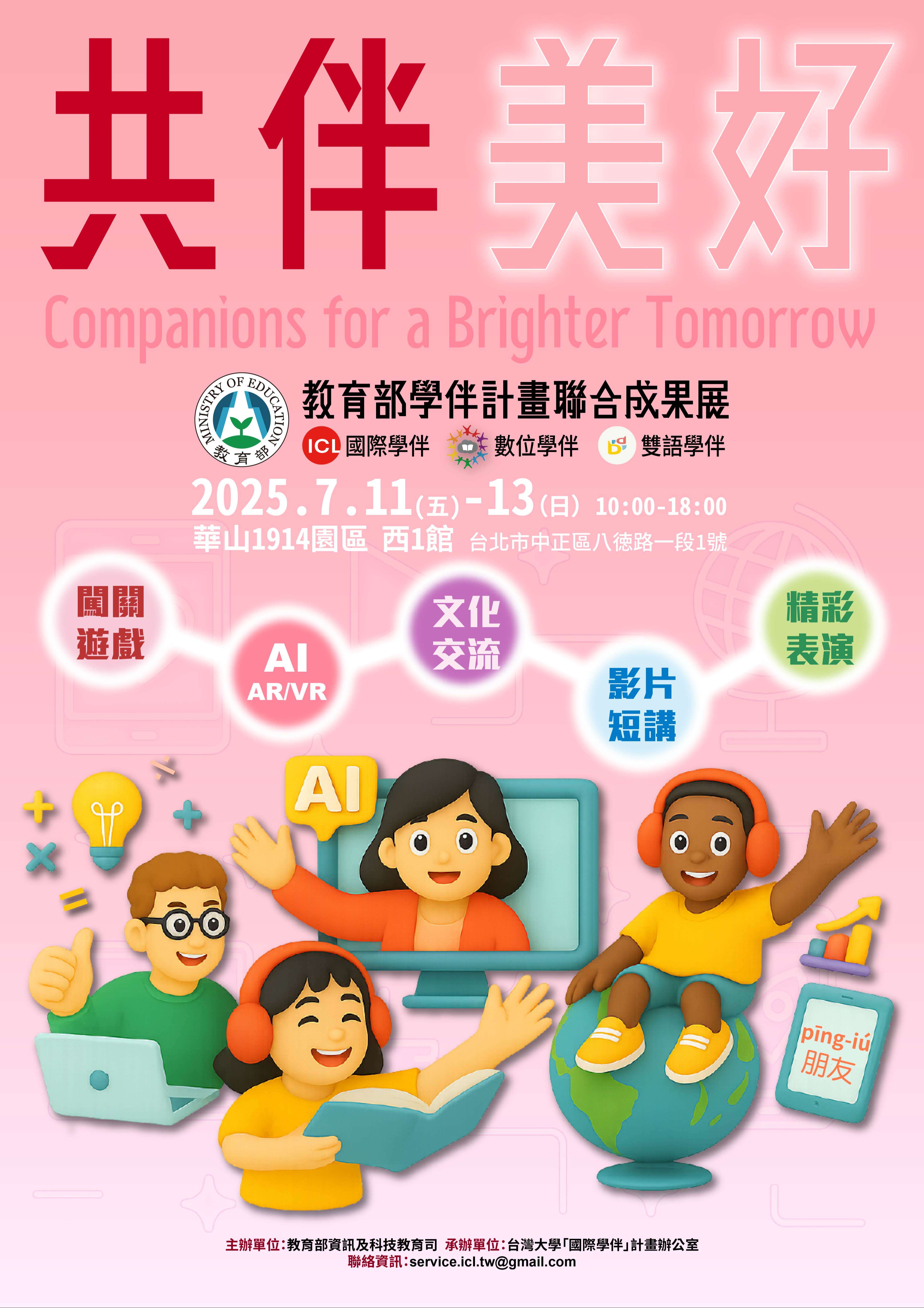 二、教育部推動「數位學伴計畫」、「國際學伴計畫」及「雙 語學伴計畫」成果豐碩,邀請學伴計畫團隊、AI相關計畫 及民間企業共同響應,辦理旨揭成果展,歡迎親師生免費 參觀,活動資訊摘要如下: