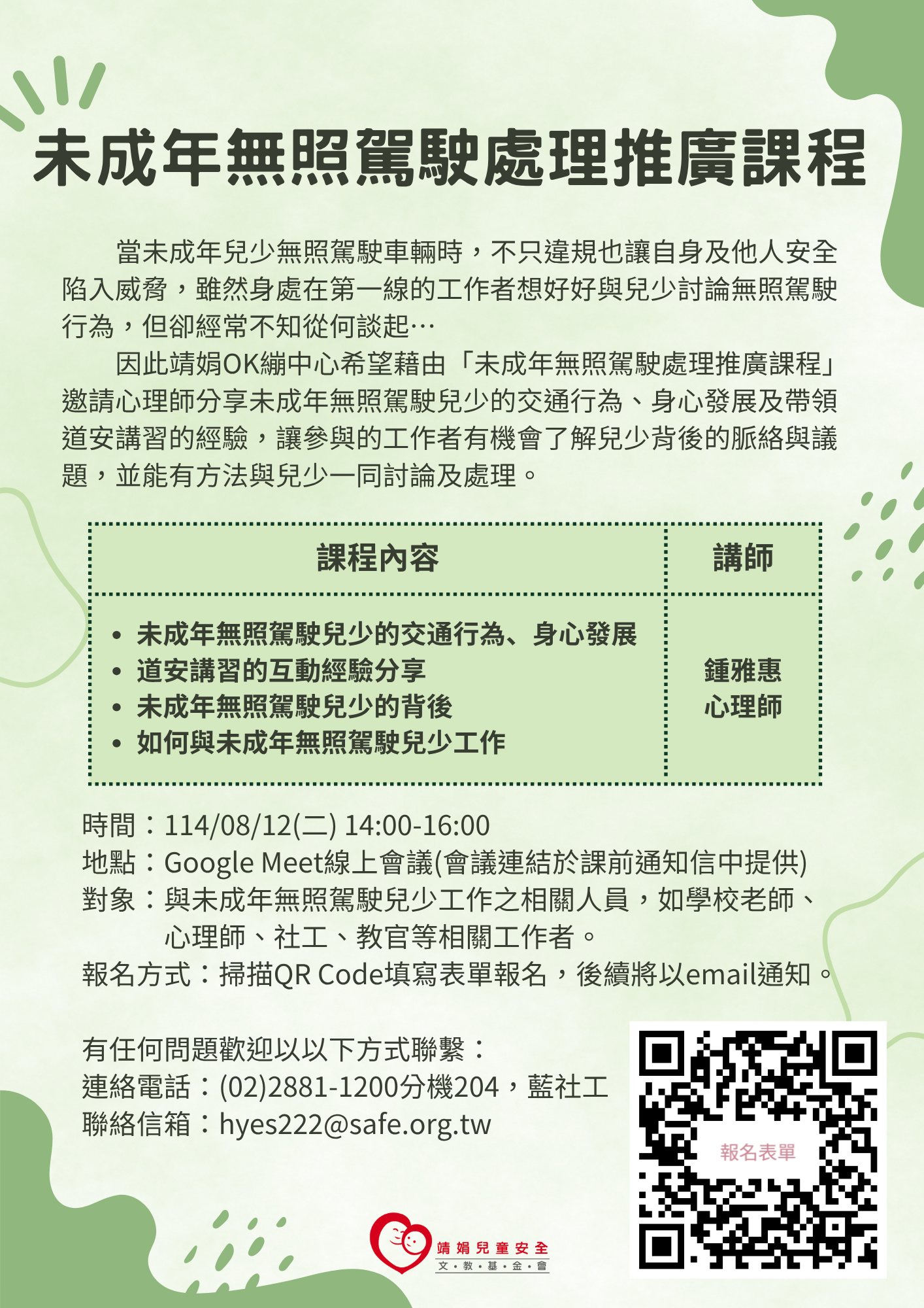 [研習資訊]函轉財團法人靖娟兒童安全文教基金會OK繃兒童服務中心辦理114年度「未成年無照駕駛處理推廣課程」